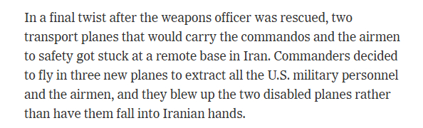 在武器官获救后,两架原本要运送突击队员和空军人员撤离的运输机却在伊朗一处偏远基地陷入地面。指挥官决定调派三架新飞机撤离所有美军人员和空军人员,并炸毁了那两架故障飞机,以免落入伊朗人手中。伊朗击落一架美军f-15战机开战以来美国最糟糕的24小时