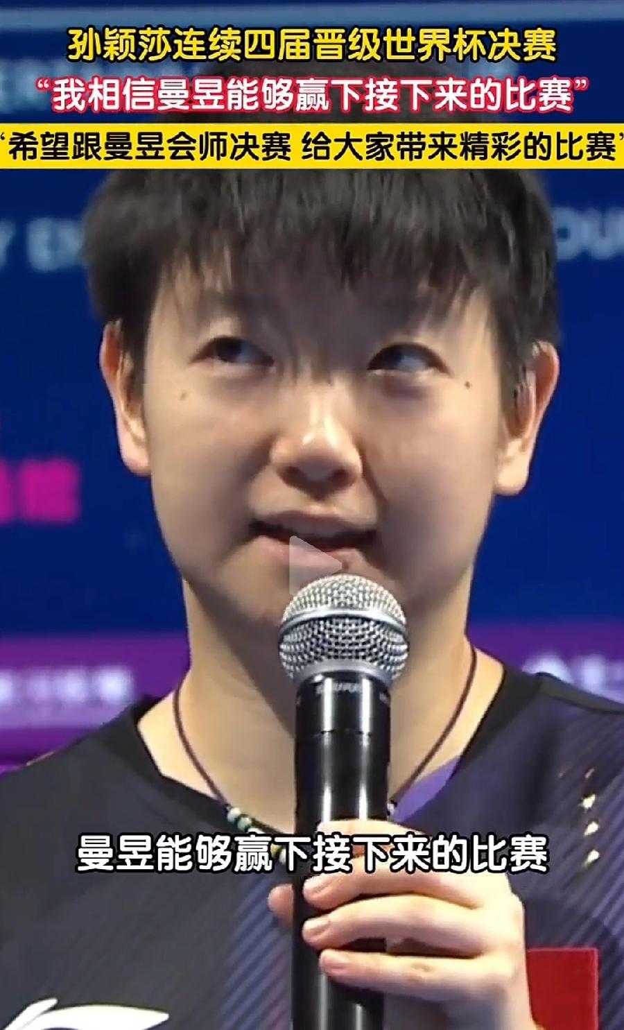 孙颖莎要创造世界杯女单冠军历史了!已进决赛,夺冠赢面很大,将成为第一位卫冕三连冠的选手!决赛对手王曼昱或者申裕斌,看历史国际比赛交手记录,莎莎对王曼昱,30场胜20场、胜率67%,对申裕斌10场全胜!所以,只要不出意外,莎莎胜券在握,关注后续比赛!