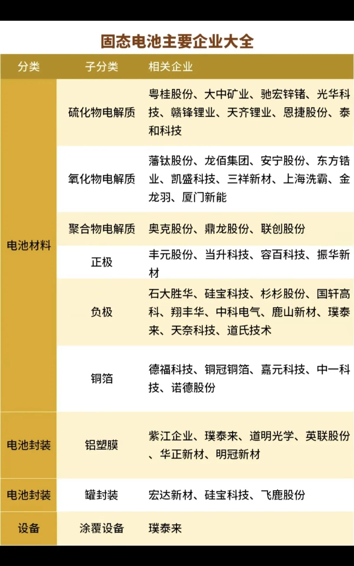 固态电池产业链全景解析 当前固态电池赛道正进入产业化关键期,这张产业链梳理清晰呈现了国内企业的全环节布局,也揭示了行业的发展脉络与竞争格局。 从产业链维度看,固态电池已形成从材料、设备到产品、厂商的完整生态。上游材料环节,硫化物、氧化物、聚合物三条电解质路线并行推进,赣锋锂业、龙佰集团等企业各有布局,其中硫化物路线因高离子电导率被视为主流方向,成为行业竞争焦点。中游设备与封装环节,先导智能、璞泰来等企业提供整线设备与封装方案,为量产落地筑牢基础。下游端,宁德时代、亿纬锂能等电池厂商自建产能,同时车企与清陶、卫蓝等技术方合作推进装车测试,多路径并行推动商业化落地。 值得关注的是,行业呈现“技术路线分化+全链协同”的特征。不同技术路线仍在博弈,尚未形成绝对统一方案,而材料、设备、整车企业的深度绑定,成为降低产业化风险的关键。当前多数企业仍处于中试线验证阶段,未来1-2年将是量产落地的关键窗口,设备与上游材料环节有望率先受益。 整体而言,固态电池正从实验室走向工业化,产业链各环节企业正加速卡位,但技术迭代、成本控制与规模化生产仍是待解难题,行业发展仍需时间验证。