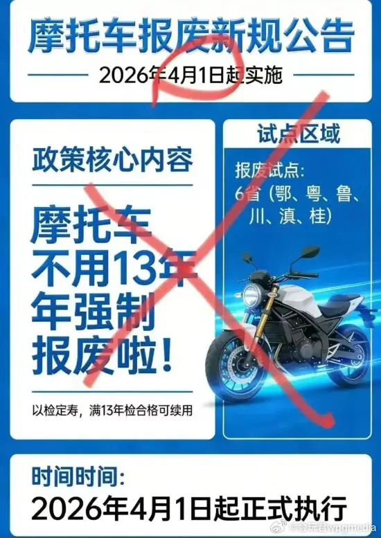 “摩托车取消13年强制报废”引全网热议:车管所回应近期,社交平台上“摩托车取消13年强制报废”、“2026年4月1日起全国实施以检定寿,满13年检合格可续用” 等消息广泛传播,引发大量车主关注。针对这波传言,多地车管所已经给出了明确回应,打破了大家的猜测。其中,柳州市公安局车辆和驾驶人管理所直接明确表示,这些说法都是不实消息,国家并没有取消摩托车13年强制报废的规定。目前全国统一的现行标准还在正常执行,13年报废也是全国统一的法定底线,没有任何变动。根据《机动车强制报废标准规定》,摩托车的强制报废标准全国统一,而且没有做任何调整:普通两轮摩托车和边三轮摩托车,只要使用满13年,或者累计行驶里程达到12万公里,满足其中一个条件,就必须强制报废。至于正三轮摩托车,报废标准则略有不同,使用满12年,或者累计行驶里程达到10万公里,只要满足其中一项,就需要强制报废。车管所也提醒大家,摩托车报废相关的政策,一定要以官方发布的公告为准,别轻易相信网上的各种传言。如果摩托车已经达到报废年限,车主一定要及时去办理报废手续,千万不能再开上路,避免出现违法违规的情况。