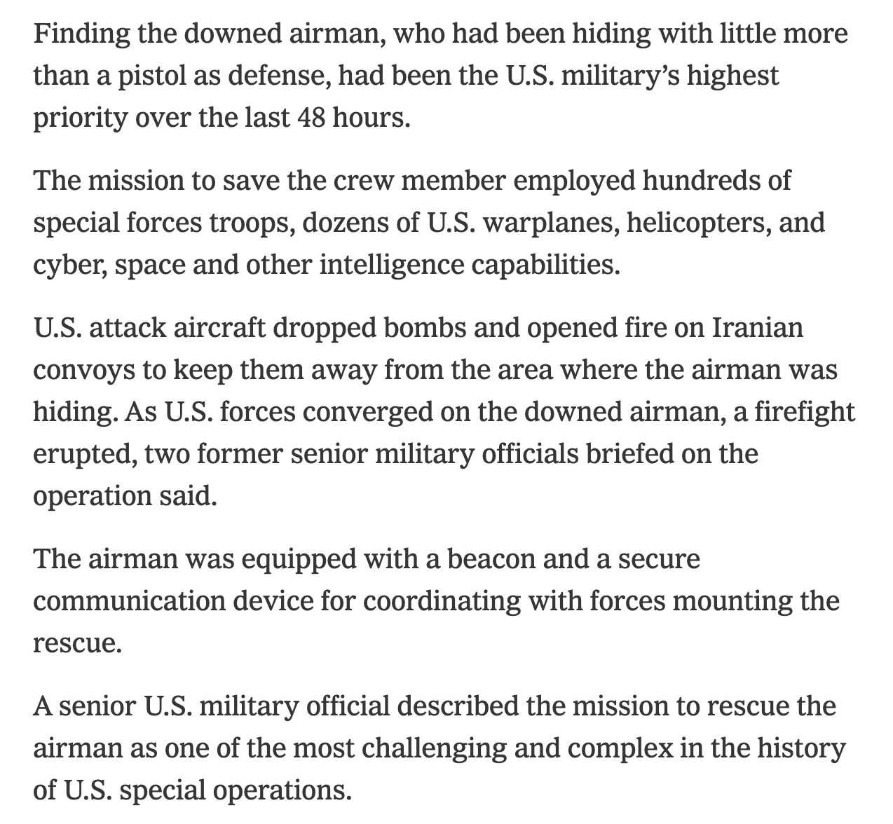 Axios:🚨一位特朗普政府高级官员称,在找到那名武器系统官并展开美军救援行动之前,中情局(CIA)首先发起了一场欺骗行动,在伊朗境内散布消息称美军已经找到他,并正在地面转移,准备将其撤离出境。