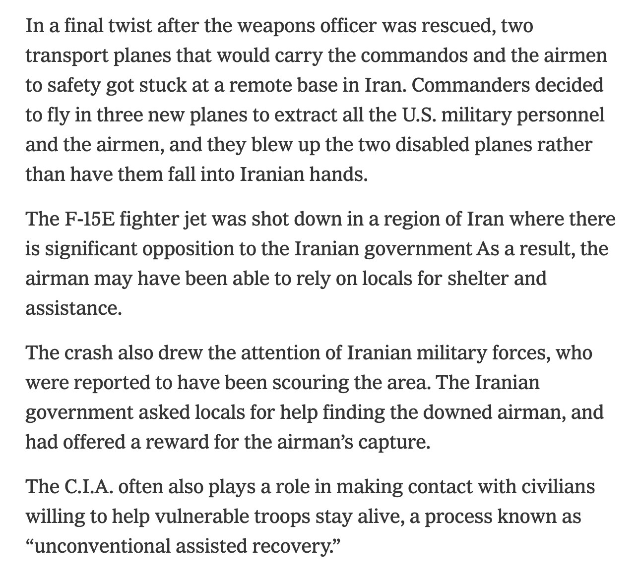 此外,CIA在这类行动中通常也会发挥作用,负责联系愿意帮助受困美军士兵存活下来的平民。这一流程在美方内部被称为“非常规协助回收”(unconventional assisted recovery)。伊朗击落一架美军f-15战机开战以来美国最糟糕的24小时