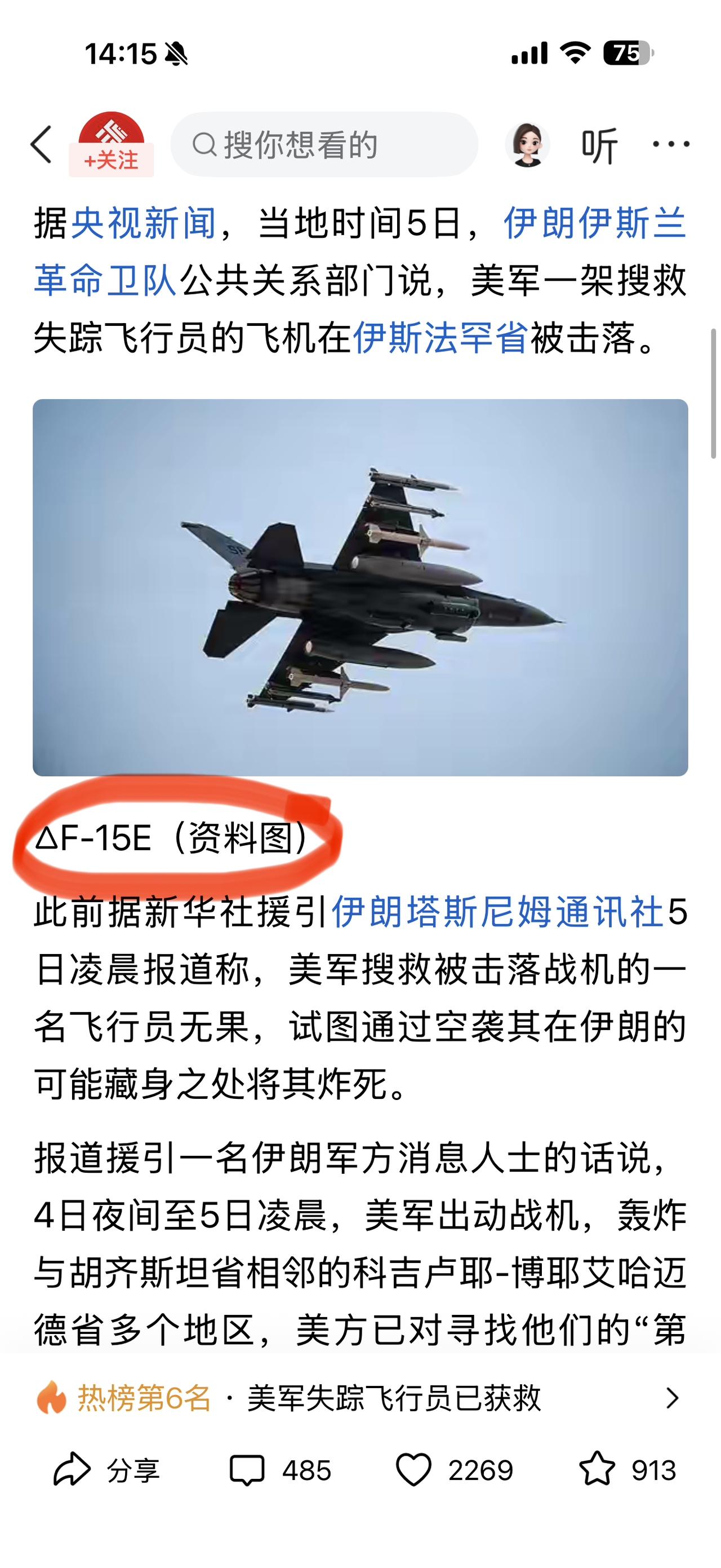 《九派新闻》在发稿的时候,能不能严谨一点? 作为湖北省《长江日报》旗下的媒体,发稿、选图应该有审核吧? 我不是军事迷,但是也只知道美国的F-15E战斗机是“双发动机”的型号。配图上明显是一架单发战斗机,肯定不是F-15E战斗机! 《九派新闻》随便弄张照片作为配图,显得很不严谨!毕竟你们不是自媒体,公信力就体现在点点滴滴之中! 希望《九派新闻》越办越好!