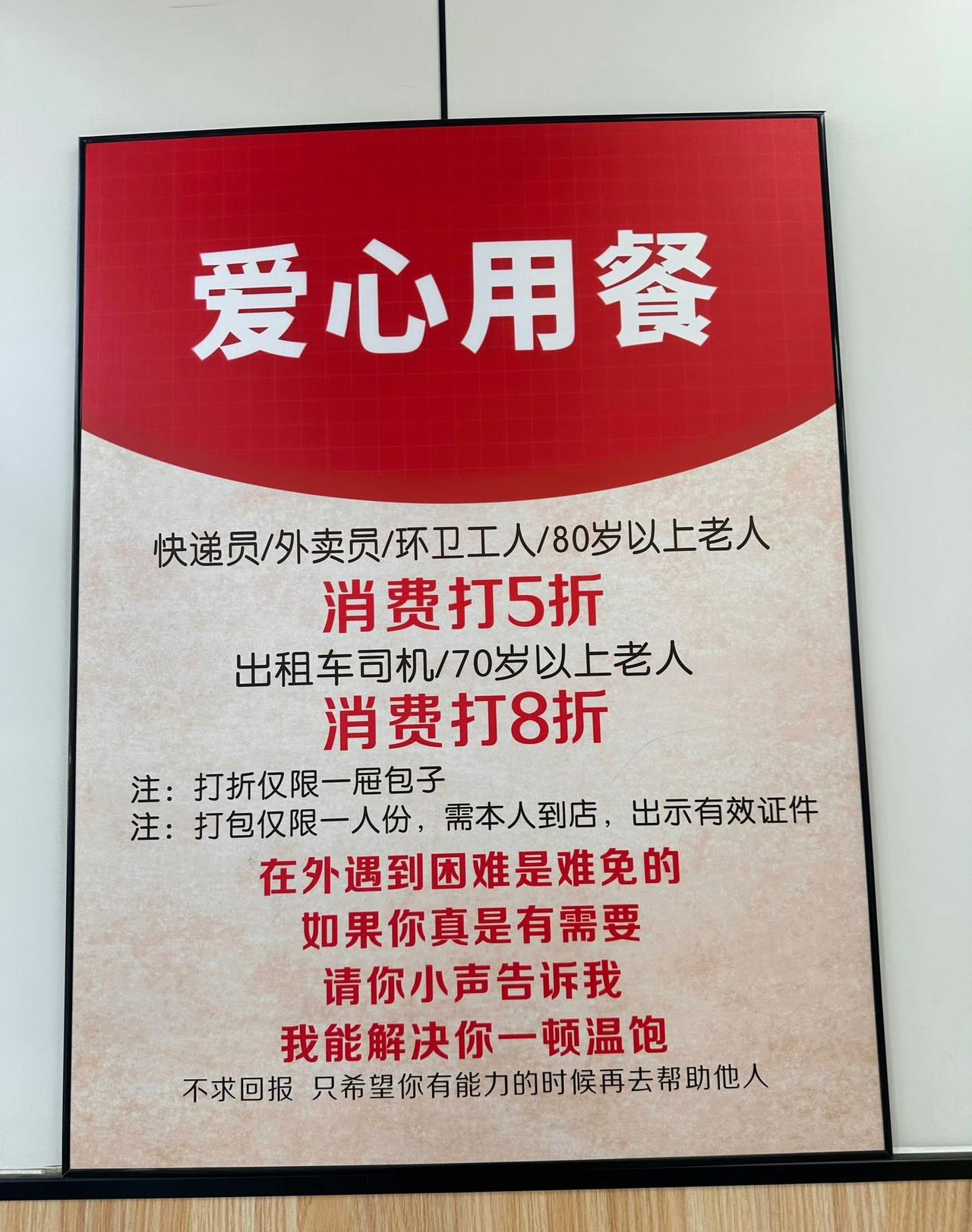 挺感动这家小吃店老板的仁义,主动给这位 85 岁的大爷吃饭打五折。店员看到颤巍巍的老大爷走进店里,点了一份餐,店员主动问大爷多大年纪,大爷说他 85。店员说按规矩可以给大爷打五折。原来在他们店里挂了一块告示,80 岁以上的人打五折,外卖清洁工快递员打八折。如果是那些在城市里面遇到困难无钱吃饭的人,也可以和店员说他们免费提供一餐饭。老板小小的善心让人感觉非常的温暖,是个有格局的人,希望他生意越来越好。