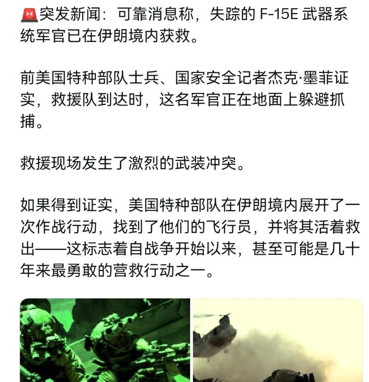 有消息称,美国飞行员已经被救出! 4月5日,外媒报道称,失踪的F-15E飞行员已从伊朗境内获救。前美国特种部队士兵和国家安全记者杰克·墨菲证实,当救援队到达时,这名军官正在逃避地面上的捕获。救援现场发生了激烈的武装冲突。外媒表示,如果得到证实,这将是美国特种部队在伊朗境内自战争开始以来最大胆的救援任务之一,可能是几十年内最大胆的一次。 4月3日,一架美军F-15E“打击鹰”战斗机在伊朗境内被击落了。这可不是小事,要知道F-15E可是美国空军的王牌战机,一架造价就得三千多万美元。飞机上坐着两个人,一个是飞行员,一个是武器系统操作员。飞机一被打下来,两人赶紧弹射跳伞,结果就掉在了伊朗西南部的山区里。 这下可热闹了。伊朗伊斯兰革命卫队和当地民兵立马出动,漫山遍野地搜捕,甚至还开出了六万美元的悬赏,就为了抓住这两个飞行员。在伊朗的地盘上,两个美国军人要是被活捉了,那政治筹码可就大了去了。 美国这边更着急,自己的人落在敌人手里,这传出去多丢面子。于是美军特种部队立马行动起来,开始了这场“与时间赛跑”的救援行动。第一个飞行员运气不错,坠机后没多久就被救出来了。可第二个武器系统操作员就没那么走运了,他在山区里躲了整整36个小时。 这36个小时里,这位老兄可真是上演了一出“荒野求生”。他靠着在特种部队学到的“生存、规避、抵抗、逃脱”技能,在山里跟伊朗搜捕队玩起了捉迷藏。一会儿躲在山脊上,一会儿启动紧急信标,还得时刻提防被当地牧民发现。据说他受了伤,但还能走路,就这么在伊朗的深山老林里硬扛了一天半。 到了4月4日,美军终于锁定了他的位置。这下好戏开场了。美军派出了精锐突击队,还有一大堆空中掩护——什么MH-60“铺路鹰”直升机、AC-130J“幽灵骑士”空中炮艇,能上的全都上了。救援队降落到预定地点时,果然跟守在那里的伊朗武装力量撞了个正着。双方在黑暗中噼里啪啦打了起来,枪声那叫一个激烈。 根据报道,这次交火至少造成了4人死亡。美军这边也不轻松,有消息说在救援过程中,一架A-10攻击机被击落,两架黑鹰直升机受损,还有一架MQ-9无人机被摧毁,多名机组人员受伤。 甚至还有未经证实的消息说,一架A-10攻击机被击中后勉强飞回了伊拉克,一架F-16战机和一架KC-135加油机都挂起了紧急代码。这代价可真不小。 但不管怎么说,美军特种部队还是硬生生把人给抢回来了。所有参与行动的美军人员都安全撤离了伊朗。特朗普总统高兴得不得了,在社交媒体上大肆宣扬,说这是“美国历史上最大胆的搜救行动之一”。他还特别强调,美军出动了数十架“携带世界上最致命武器的”飞机和直升机前去营救。 现在咱们来分析分析这事儿背后的门道。首先,这次救援行动确实够大胆的。想想看,在伊朗的领土上,跟伊朗正规军交火,还能把人救出来全身而退,这操作难度不是一般的大。难怪外媒说这可能是几十年来最大胆的一次救援任务。 其次,这次行动暴露了美伊冲突的激烈程度。F-15E这种级别的战机都被打下来了,说明伊朗的防空能力不容小觑。而且从救援过程中发生的激烈交火来看,双方在地面上的对抗也很直接。这可不是小打小闹,是真刀真枪的干。 再者,这次救援成功对美国来说意义重大。要是飞行员被伊朗活捉了,那美国在外交上就太被动了。现在人救回来了,美国就可以继续强硬下去。特朗普那句“美国不会留下任何一个士兵”的喊话,听着挺霸气,但实际上也是在给自己找台阶下。 最后,这次事件也反映出现代战争的一个特点:救一个飞行员的成本,可能比飞机本身还贵。为了救这两个人,美军动用了那么多资源,损失了那么多装备,这账算下来可真不划算。但没办法,人在战场上就是最宝贵的资源,再贵也得救。 总的来说,这次救援行动虽然成功了,但也让全世界看到了美伊冲突的残酷性和复杂性。两个大国在伊朗的土地上较劲,最后倒霉的还是那些在前线拼命的大兵。这事儿过后,两边的关系估计会更紧张,接下来的戏码还有得看呢。