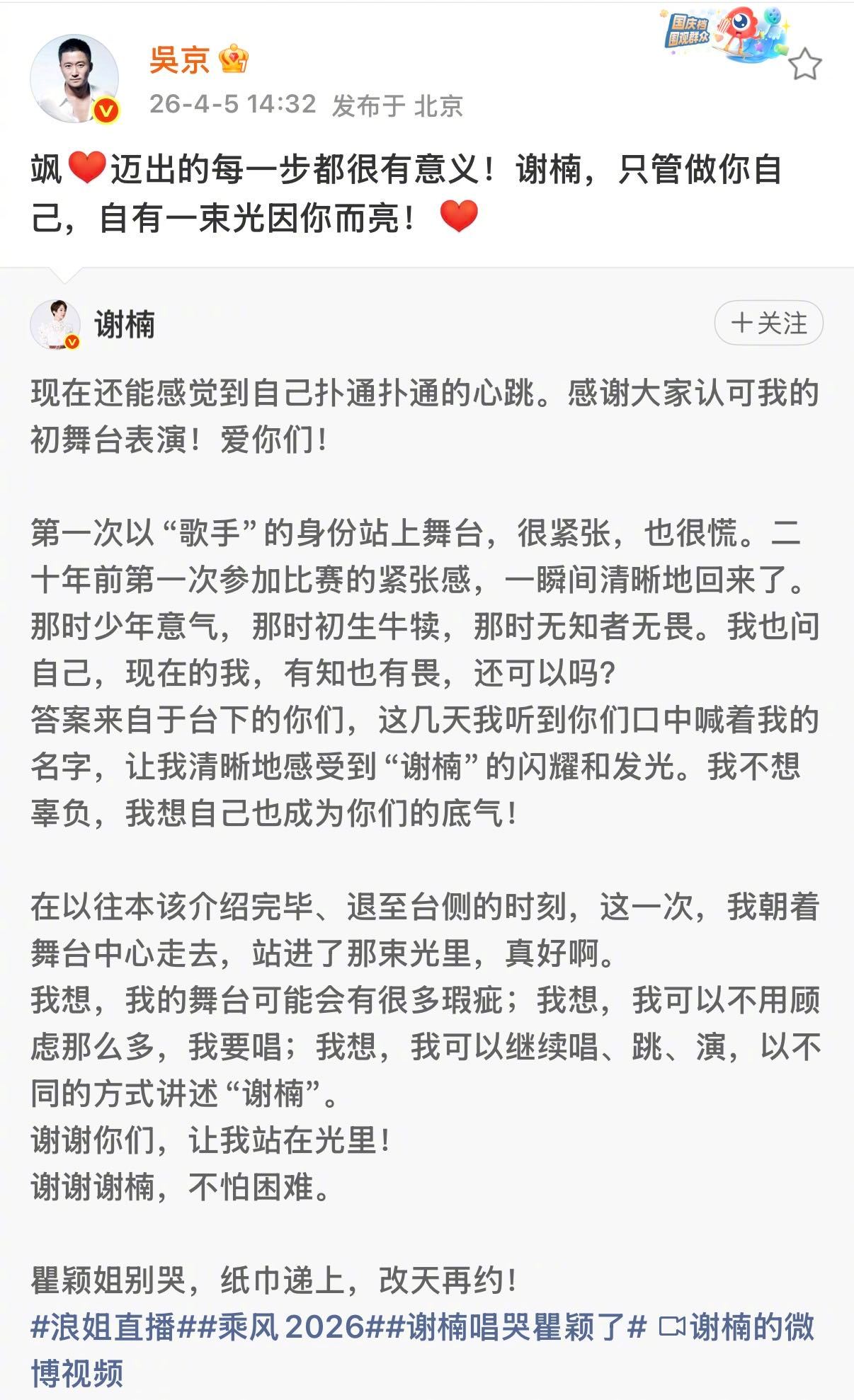 吴京夸谢楠初舞台飒 真夫妻的糖真的好嗑到停不下来!谢楠《乘风2026》初舞台,吴京转发暖心表白:“谢楠,只管做你自己,自有一束光因你而亮!”默默支持又温柔有力,“总有人为你而来”在这一刻得到了回响。被吴京谢楠双向应援甜到了