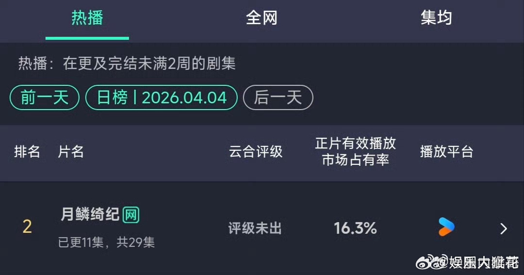 月鳞绮纪云合三连跳逐玉云合依旧领跑逐玉播完这么久了依旧在领跑,陈都灵鞠婧祎得新剧也不甘示弱、才播了不到一周,这数据很可人了逐玉 19.3% 4350万上下月鳞绮纪 云合16.3%3670万上下白日提灯 10.1% 2280万上下危险关系 4.9% 1100万上下叵测 3% 670万上下钢铁森林 次日2.3%,520万上下
