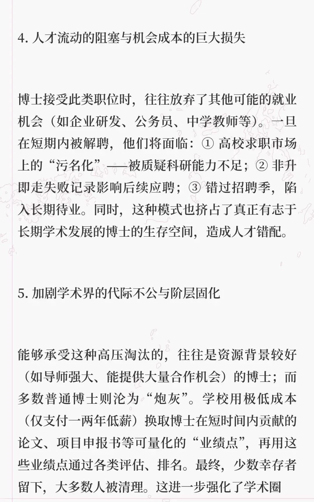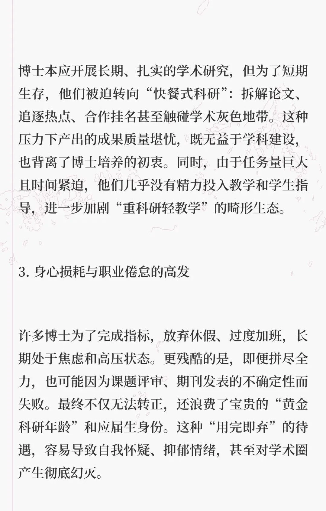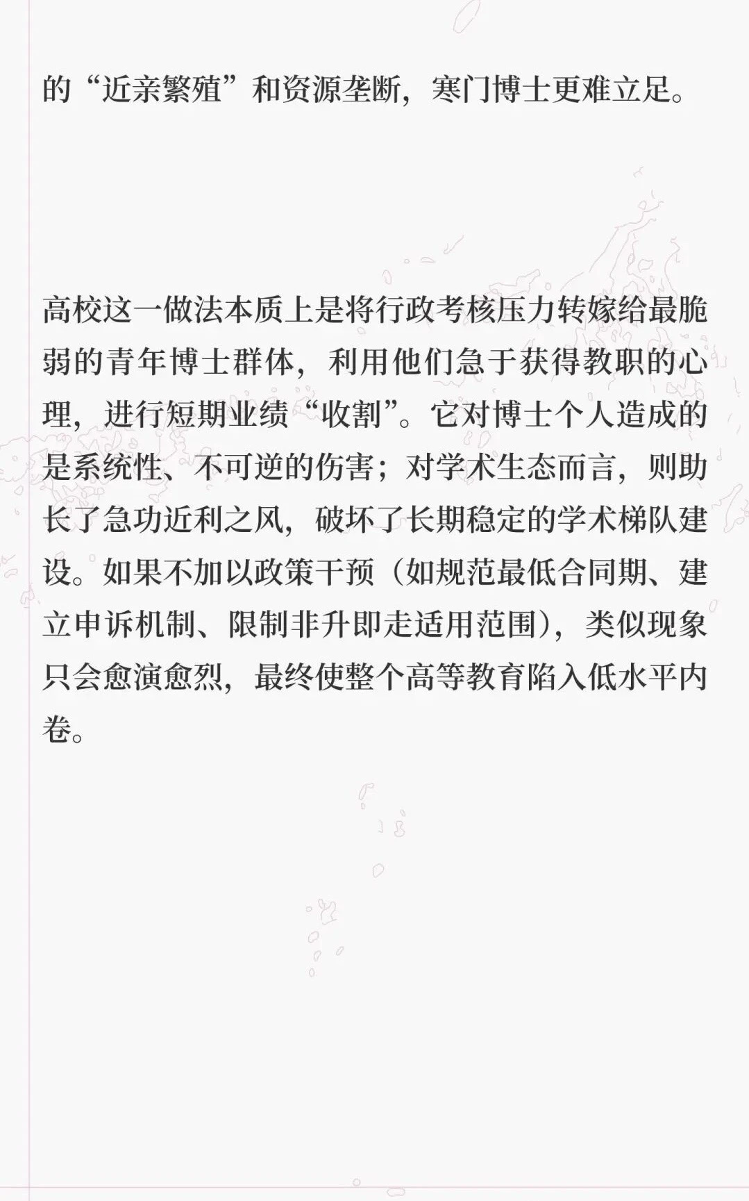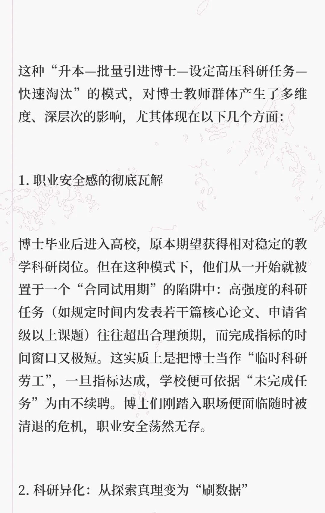 博士不是耗材: 高校升本盛宴后的“学术弃子” 当前,许多专科院校已升格为本科。升本之后,这些学校会大量招聘博士,以满足本科院校对博士教师占比的要求。然而,目前整个高校环境是教师多、课程少、学生少,师资整体趋于饱和。当专科升为本科、大量引进博士教师并完成博士占比指标后,学校往往会为新入职的博士设定短期内高标准科研任务。这样设计的意图,是利用博士的头衔帮助学校迅速达成相关指标,然后再将这些博士教师快速解聘。
