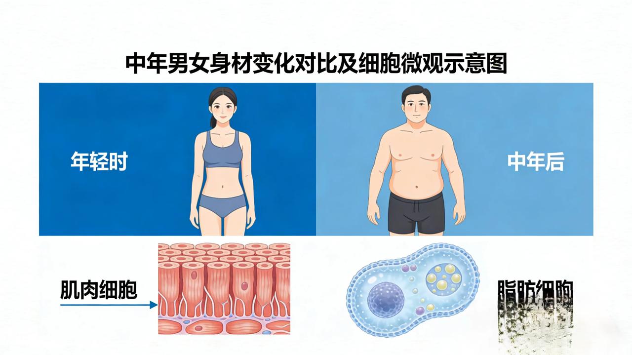 终于找到中年发福密码,看完恍然大悟 人到中年,身材仿佛突然失控:吃得不比年轻时多,运动也未曾间断,体重却悄悄上涨,腰腹赘肉堆积、小腹日渐凸出,不少人无奈感慨“喝水都长肉”。长期以来,人们普遍将中年发福归咎于代谢变慢,可权威研究与官媒报道证实,这一认知恰恰是误区,中年发福的真正根源,藏在身体多重生理变化与生活习惯的共同作用中。 打破固有认知的核心结论,源自《科学》《自然·医学》等国际顶级期刊,以及央视网、新华网等权威平台发布的研究成果。2021年《科学》杂志刊载的跨国研究,对29个国家6421名受试者进行长期追踪后发现,20至60岁人群的基础代谢基本保持稳定,每年仅下降0.5%至1%,这样的降幅远不足以导致明显发胖。2024年《国际肥胖杂志》覆盖815万人的研究也进一步印证,35岁后BMI指数年均增长约0.1,35至39岁是中年发福高峰期,代谢衰退绝非发胖主因。 中年发福的首要元凶,是肌肉量的悄然流失。30岁之后,人体肌肉便开始以每年0.5%至1%的速度减少,40岁后流失速度明显加快。肌肉是身体的“燃脂引擎”,每公斤肌肉每日能消耗约13千卡热量,肌肉量减少会直接降低身体日常热量消耗,即便饮食量和年轻时完全一致,多余热量也会转化为脂肪囤积。与此同时,男性30岁后睾酮水平每年下降1%至2%,女性进入更年期后雌激素水平骤降,激素水平的大幅波动,进一步抑制肌肉合成、加速脂肪堆积,让中年身材走样变得难以避免。 脂肪细胞的异常活跃,是中年发福的关键深层原因。2025年《科学》杂志发表的美国希望之城医学中心研究,揭开了这一细胞层面的机制:中年阶段,体内会出现特异性脂肪前体细胞CP-A,其分化生成脂肪细胞的效率,是普通细胞的数倍。这类细胞被激活后,会优先在腹部内脏区域大量增殖,让脂肪不仅体积增大,数量也大幅增加,最终形成难减的“中年肚”。央视网相关科普报道也指出,人到中年,脂肪组织脂质周转能力下降,储存脂肪、分解脂质的效率变低,体重自然易升难降。 除此之外,生活习惯的隐形变化,也在不断加剧中年发福。中年人大多面临职场与家庭的双重压力,久坐办公成为常态,每日活动量悄然减少,热量消耗随之降低300至500千卡。压力升高还会促使皮质醇分泌增加,刺激食欲,让人不自觉偏爱高糖、高脂食物,再加上职场应酬、夜间加餐增多,饮食热量在不知不觉中超标。同时,中年后睡眠质量下滑、肠道菌群发生改变,身体从食物中吸收热量的能力进一步增强,多重因素叠加,让脂肪囤积速度大幅加快。 中年发福并非不可逆的生理必然,找准核心原因,就能开展科学干预。日常可增加力量训练,每周进行2至3次抗阻运动,有效延缓肌肉流失;调整饮食结构,减少精制碳水摄入,多补充优质蛋白与膳食纤维;保持规律作息,及时疏解压力,避免皮质醇紊乱。找准方向针对性调整,就能有效控制体重,摆脱中年发福的困扰。 你到中年后,有没有感觉自己更容易发胖了? 中年发福真相 科学控重信息来源:央视网、新华网、《科学》杂志 本文配图为A1生成,仅供参考