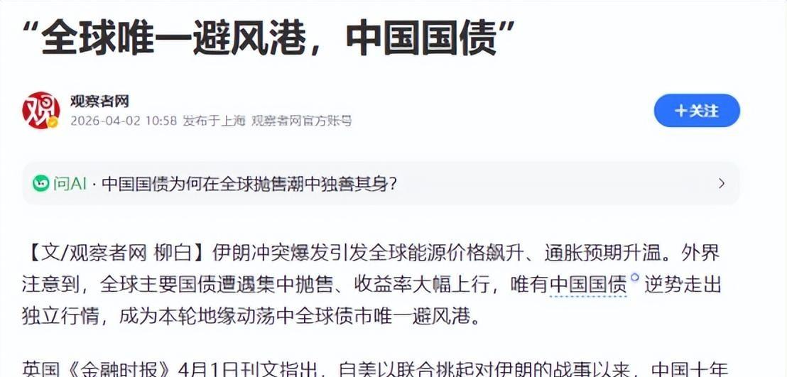 几十年来,华尔街死死捂着一个发财密码:大炮一响,黄金万两,闭着眼买美债准没错。 可谁能想到,这几天中东那边的炮火刚把天际线映红,纽约交易所的交易员们却看着屏幕大跌眼镜。 曾经号称全球最安全避风港的美国国债,正遭遇一场史无前例的疯狂抛售,而资金出逃的终点,居然全指向了东方。 要知道,自打布雷顿森林体系建立以来,美元霸权就和美国航母一样,是响当当的硬通货。 不管地球哪个角落爆发冲突,全球各路资本的第一反应,绝对是把钱全换成美国国债。 在那些金融大鳄眼里,这不仅是一张纸,更是白宫用十一艘核动力航母做担保的铁血契约。 当以色列和伊朗的导弹在夜空中相互问候时,美债不仅没有迎来预期中的抢购潮,反而惨遭血洗。 短短几天时间,美国10年期国债收益率如同脱缰野马,一口气狂飙38个基点,直接捅破了4.34%的警戒线。 金融圈的内行都懂,债券收益率飙升的唯一原因,就是大家都在不计成本地疯狂抛售。 不仅美国自己顶不住,就连隔壁跟着凑热闹的英国,其10年期国债收益率也直接干碎了5%的关口。 这可是直接打破了2008年次贷危机以来的最高纪录,市场恐慌情绪瞬间拉满。 摆明了就是,全球资本已经把美债从保险箱里踢了出来,直接扔进了高危垃圾桶。 翻开美国的账本你就会发现,光是最近这个财年的财政赤字就高达1.7万亿美元,印钞机都快冒出火星子了。 更致命的是,根据华尔街的推演,到今年年底,美国将有超过10万亿美元的国债集中到期。 借新钱还旧债,这本是常规操作,可现在美联储把基准利率维持在绝对高位,利息成本呈指数级爆炸。 在这个节骨眼上,如果再卷入一场战争,军费开支暴涨,通胀数据绝对会像脱靶的洲际导弹一样彻底失控。 日本央行这个曾经的“头号接盘侠”,最近都在连夜缩减资产负债表,根本不敢接这个烫手山芋。 西方阵营的算盘打得震天响,想靠着制造地缘焦虑来收割全球避险资金,结果却被资本狠狠抽了一个大嘴巴。 英国《金融时报》满心不甘却又无可奈何地在头版写下结论:全球唯一的战争避风港,在中国。 数据不会撒谎,当西方债市哀鸿遍野时,中国10年期国债收益率死死钉在1.8%的基准线上。 不仅纹丝不动,甚至比年初的均值还要低出几个基点,这是一种四两拨千斤的恐怖定力。 没有大水漫灌,没有疯狂加息,咱们的物价指数平稳得像一面镜子,财政政策的后手更是深不见底。 欧美动辄几十万亿的债务泡沫面前,中国极低的政府杠杆率简直就是资本眼里的香饽饽。 外资机构根本不傻,北向资金买入中国债券的规模屡创历史极值,真金白银的净流入就是最好的投票。 连那些眼高于顶的国际基金经理都出面表态,中国资产的抗压能力,已经远远超出了华尔街的认知框架。 资本是最冷血的,它们不相信政客的唾沫星子,只相信实打实的安全边界和收益回馈。 过去那套靠着航母到处惹事,再靠美元收割全球的强盗逻辑,在如今这个时代已经彻底玩不转了。 真正的安全,绝不是靠开动印钞机去掠夺别人,而是靠扎实的实体经济和独立自主的战略定力稳住自己的基本盘。 世界金融版图的板块正在发生剧烈挤压,一个属于旧霸权的信用神话正在崩塌。 而这,正是东方巨龙在惊涛骇浪中,给全人类书写的一份全新标准答案。