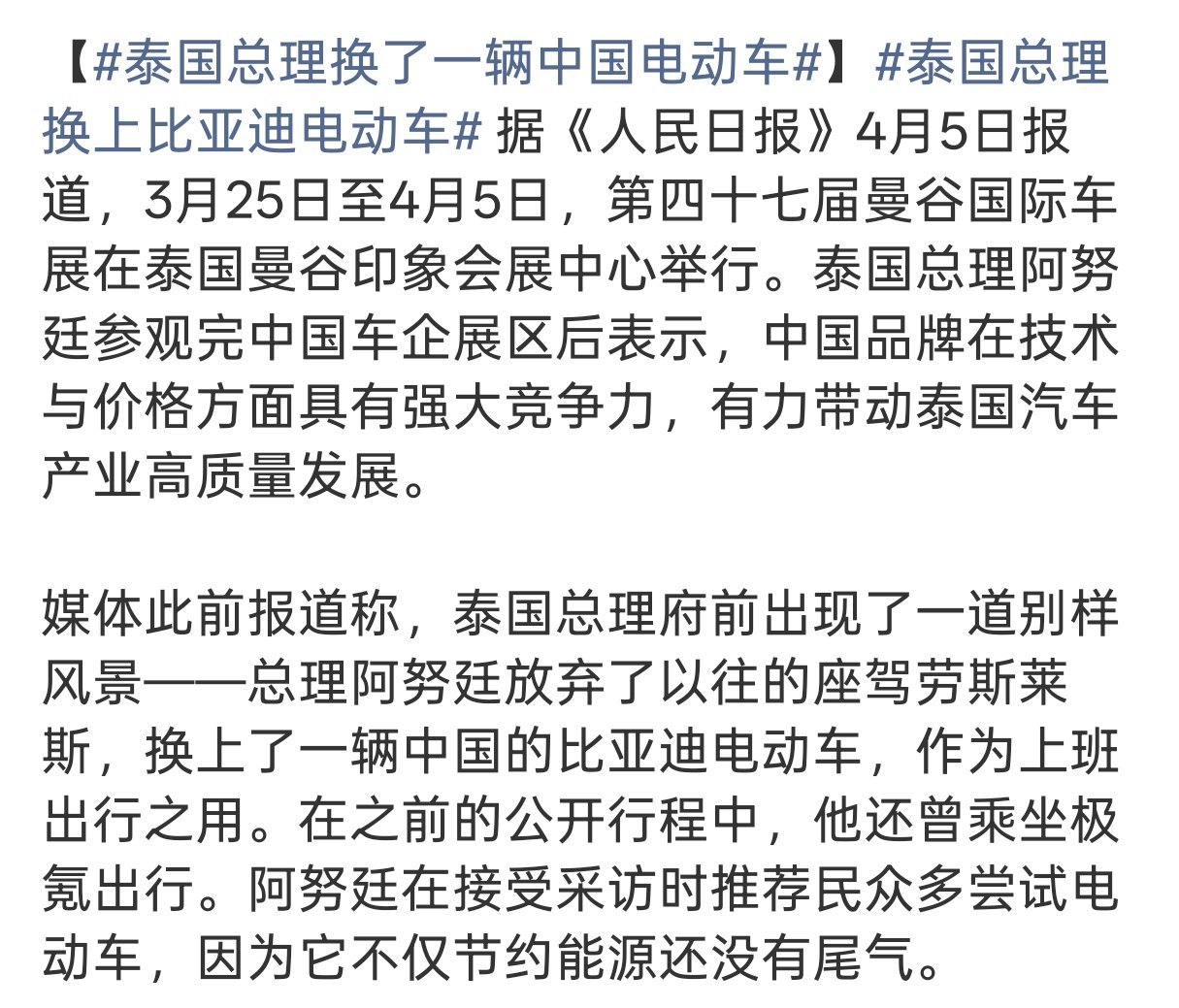 泰国总理换了一辆中国电动车整挺好,节能环保,最主要还省钱迪子这波又出镜了。