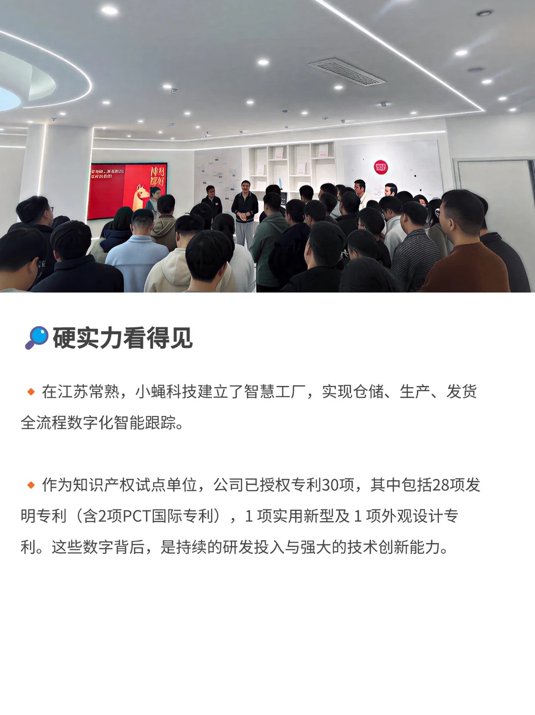 🔸在江苏常熟,小蝇科技建立了智慧工厂,实现仓储、生产、发货全流程数字化智能跟踪。作为知识产权试点单位,公司已授权专利30项,其中包括28项发明专利(含2项PCT国际专利),1 项实用新型及 1 项外观设计专利。这些数字背后,是持续的研发投入与强大的技术创新能力。