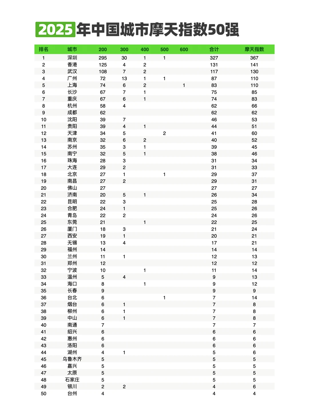 最引人注目的,依然是深港穗组成的珠三角“最强摩天圈”。深圳以367的高指数傲视群雄,这与其土地利用的极端集约和科技产业的爆发密不可分,摩天楼成了效率与创新的图腾。紧随其后的香港,则是高密度发展的经典样本。相比之下,贵阳以51的指数逆袭至第11位,则展现了中西部城市通过“强省会”战略,利用高层建筑快速塑造现代化城市形象的雄心,这极具话题性。
