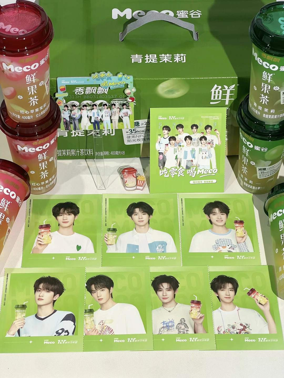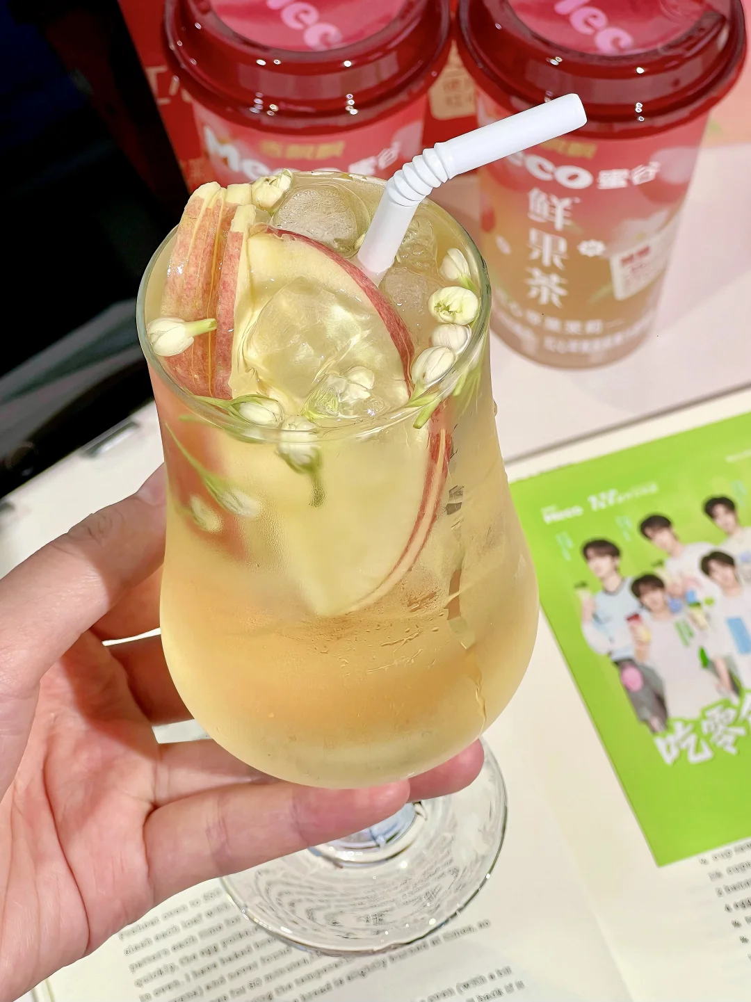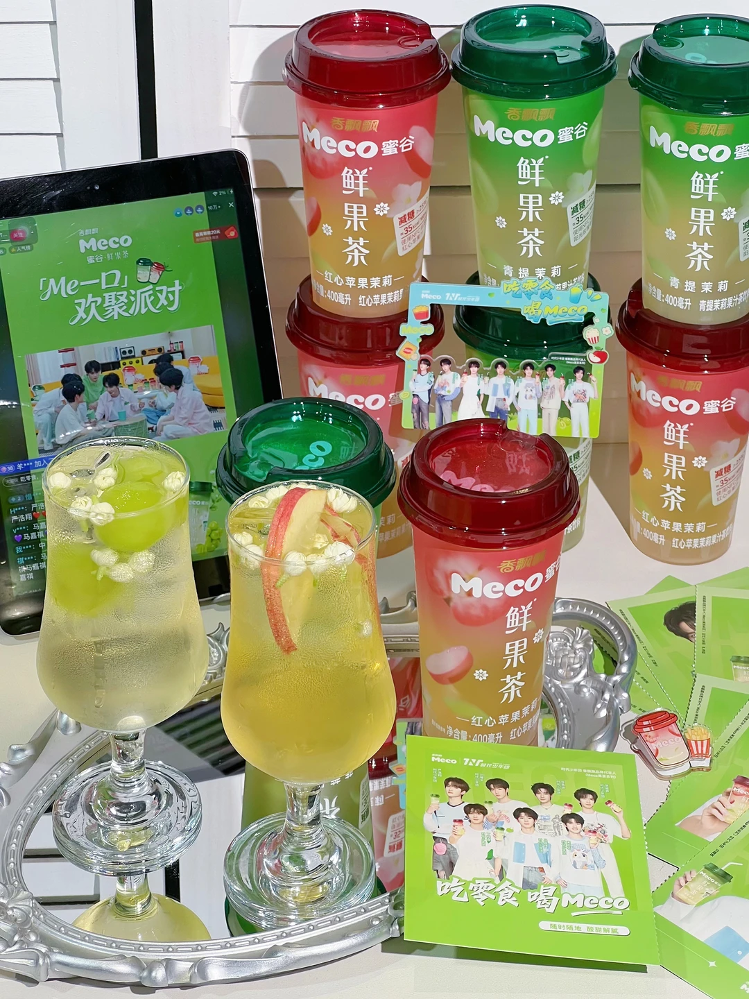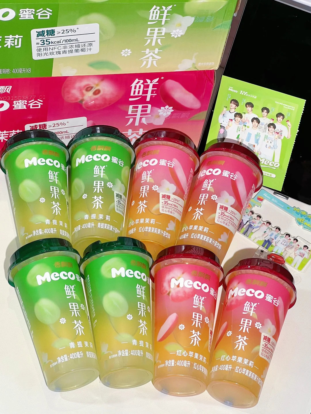 谁懂在Meco啵啵间刷到时代少年团喝播的震撼!!!😆 这回真是见识到什么叫“顶级商务”价值了! 直播还没结束呢,就咔咔抢完了!! 同款Meco鲜果茶统统拿下!! 追星女孩的快乐就是这么简单粗暴~ 🥹新品鲜果茶真的好好喝!含有真实NFC果汁,茶叶是原叶现萃的🍃 重点是减糖25%,比之前的版本更健康更好喝了👍 一杯不超过180大卡👍 而且0脂肪喝着无负担~ 解辣又解腻,吃零食绝配😍 两个口味攻略供选择⬇️ 🍎红心苹果茉莉 酸酸甜甜的,入口有苹果的果香和茉莉花香,好清爽香甜,清爽到跺脚~ 🌸青提茉莉 阳光玫瑰青提的清甜搭配茉莉茶清香,感觉满嘴都是香香的,巨清爽解腻的口感,好好喝~ 下单还有周边拿!!!亚克力水果夹、代言人明信片、代言人春日打卡棒!!超有质感,疯狂心动💓晚了真的会抢空!!😭