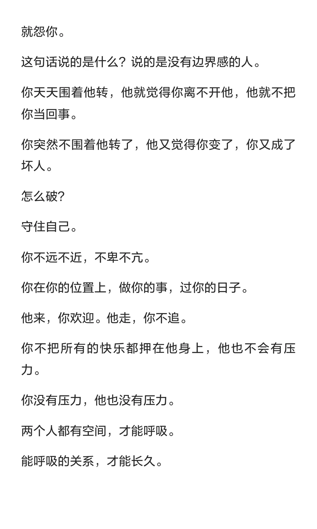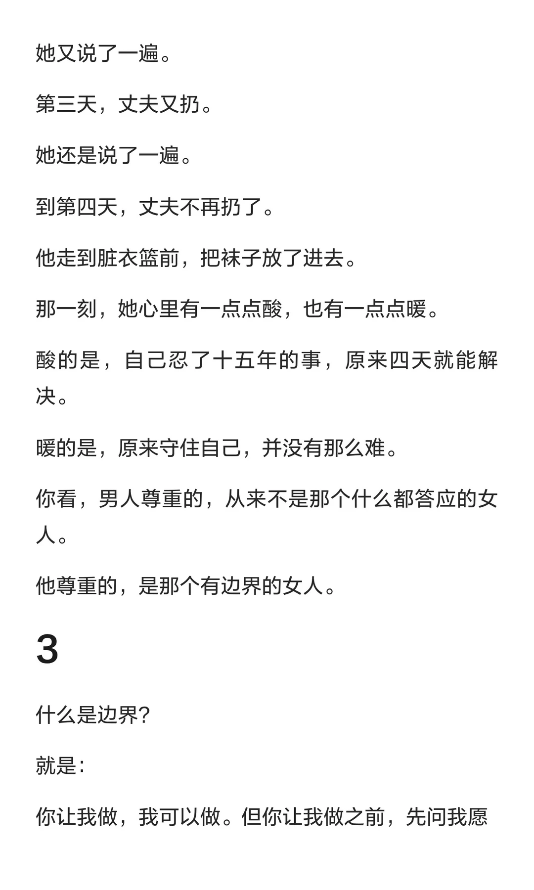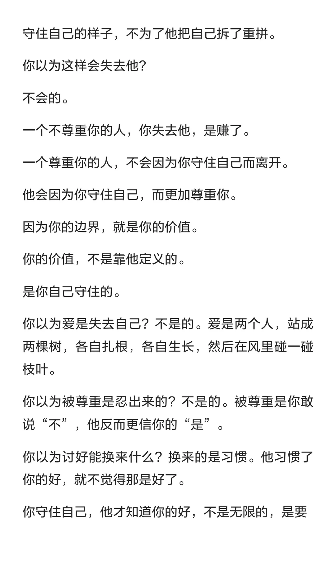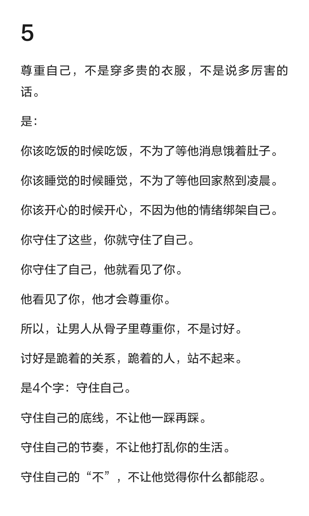 守住自己的底线、节奏和“不”,才能赢得男人的尊重,而非通过讨好或忍让。尊重的本质是看见并选择不越过你的边界。守住自己,才能赢得真正的尊重与珍惜。