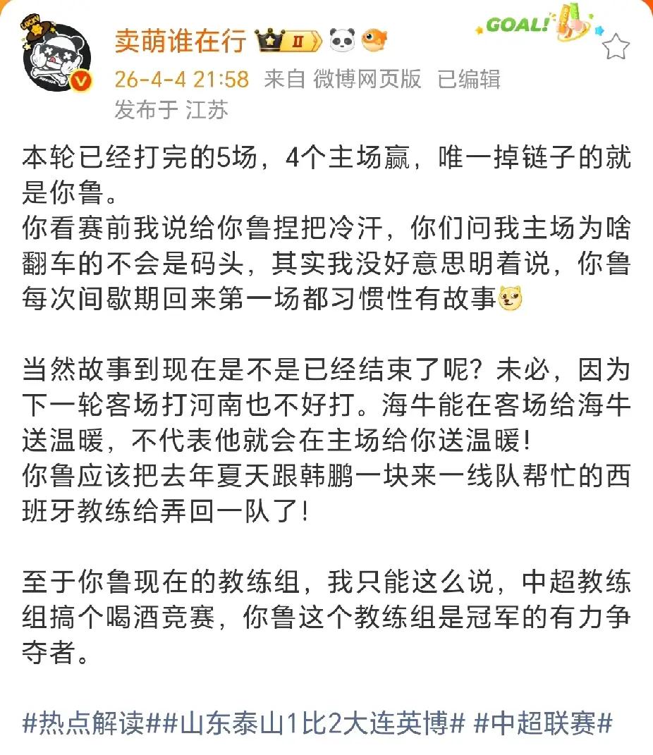 替韩鹏山东泰山队两连败找理由! 中超联赛第四轮,山东泰山队主场1比2输给了大连英博队,这已经是韩鹏带队新赛季的两连败了! 简单的说说泰山队连败理由: 1,克雷桑和刘洋没进大名单。 2,谢文能红牌停赛。 3,9 名国字号球员刚结束国家队征程,舟车劳顿的影响,让国脚们整体状态低迷。 4,在克雷桑缺席时,泽卡没能主动站出来承担责任,开场就连续两次错失绝佳破门良机。 5,卡扎伊什维利在如愿拿到大合同后,本赛季回归正常,不再是哪个‘超神的卡扎’! 6,4场联赛丢了7个球,泰山队后防线不是哪一名球员有问题,而是全有问题。 另外,知名博主“卖萌谁在行”调侃——至于你鲁现在的教练组,我只能这么说,中超教练组搞个喝酒竞赛,你鲁这个教练组是冠军的有力争夺者。 换一简单的说法:教练你不行,喝酒第一名!