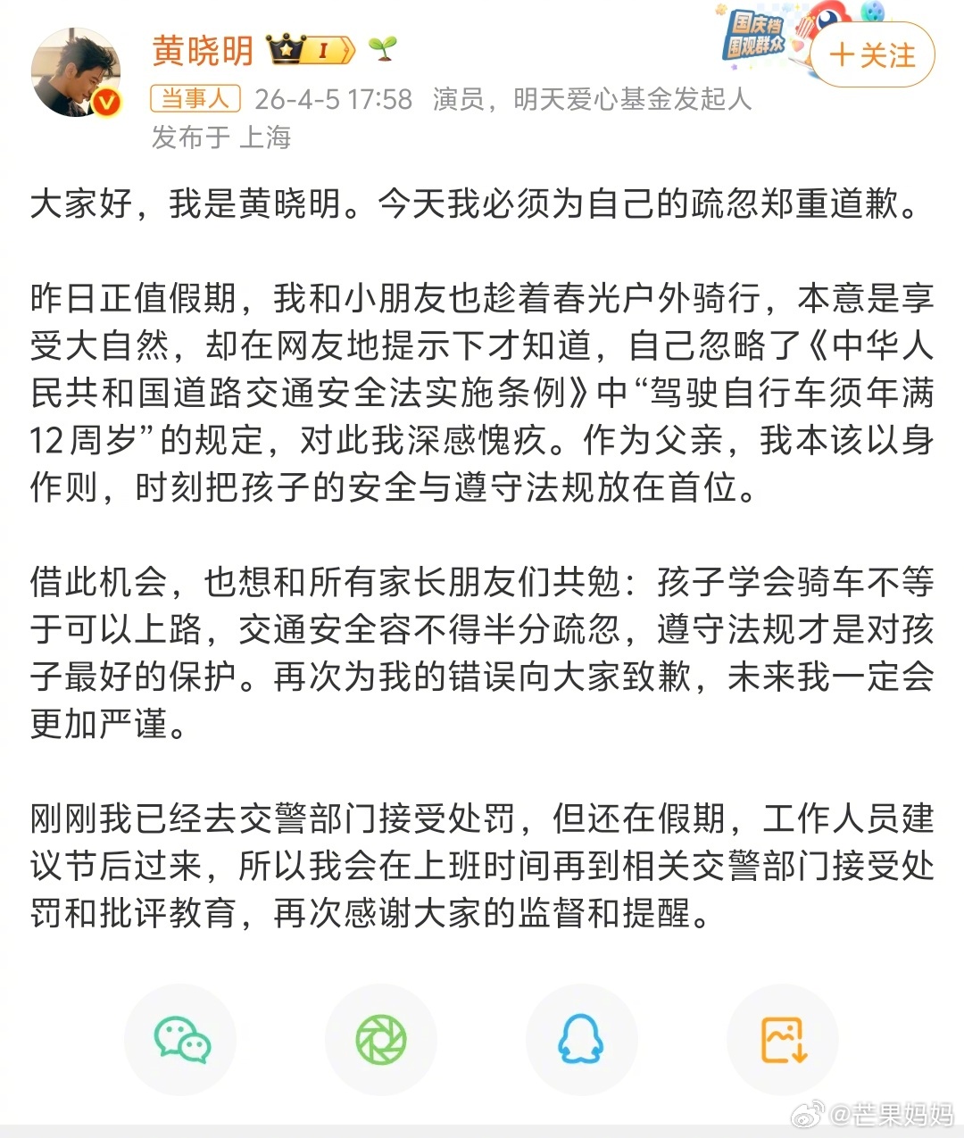 黄晓明就带娃骑行道歉