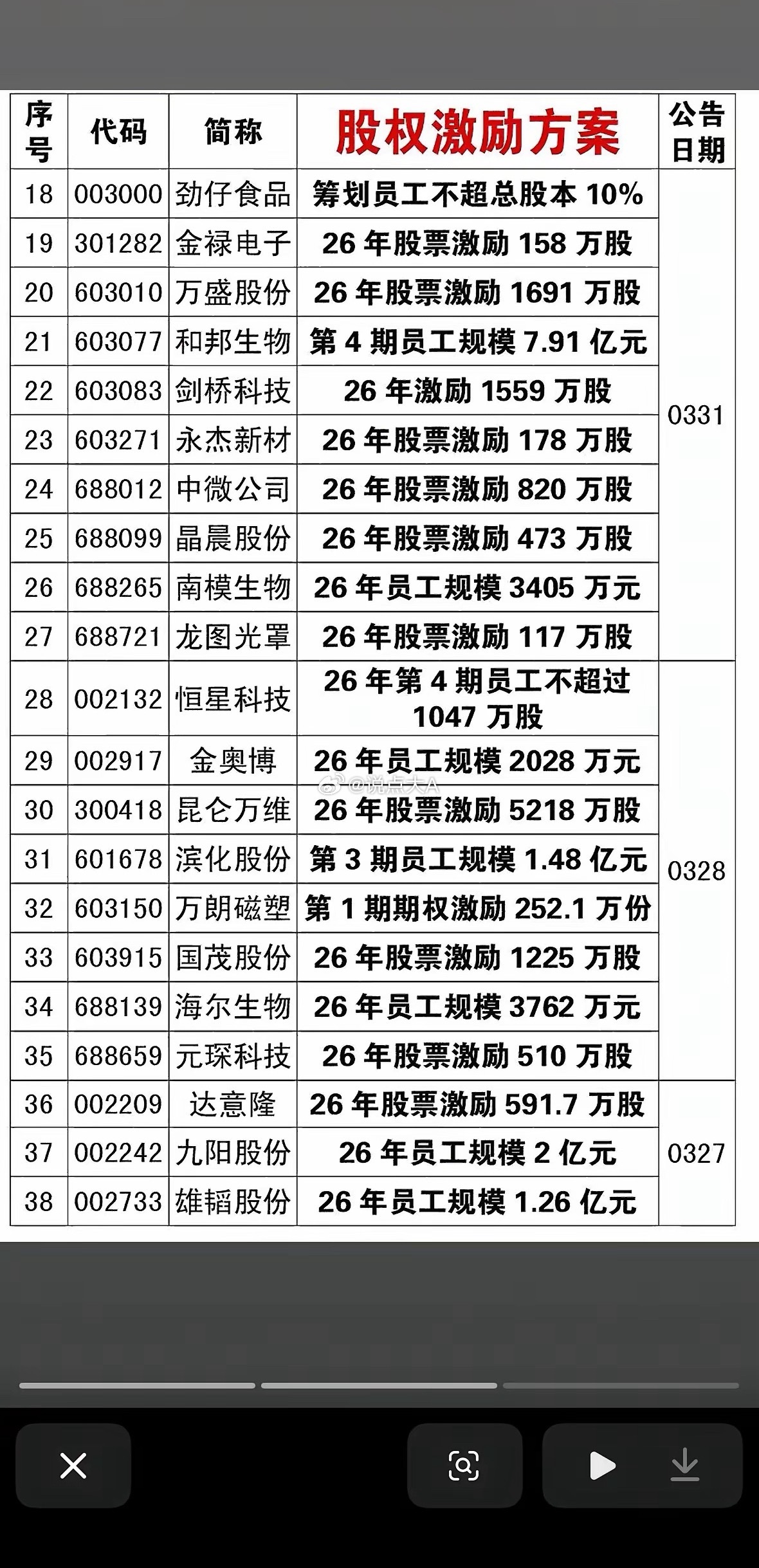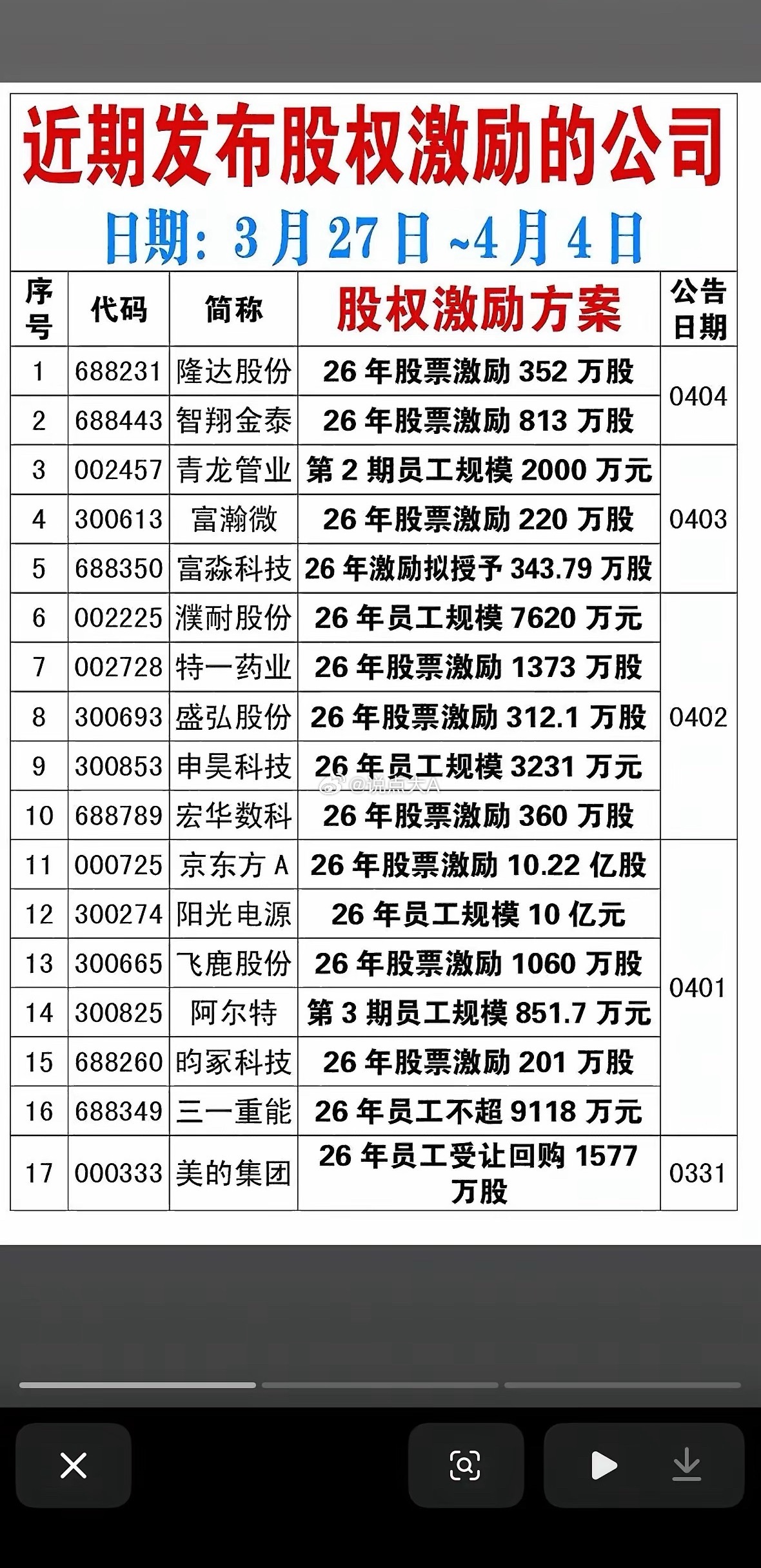 4月5日A股市场近期发布股权激励计划的公司名单。这份名单的时间跨度是3月27日到4月4日,正是清明节前的交易周。股权激励通常被市场解读为“信心信号”,意味着公司管理层对未来几年的业绩增长有底气,愿意把利益和员工绑定。结合你之前发的港股通资金流向图,这张图展示了A股内部的“基本面”利好逻辑。以下是针对这张图的深度分析:核心逻辑:股权激励 = 业绩承诺的“明牌”当一家公司推出股权激励,通常意味着管理层设定了未来几年的业绩考核目标(虽然图中未列出具体考核目标,但这是隐含条件)。这代表公司认为目前的股价被低估,或者未来业绩会有确定性增长。重点关注的“大动作”公司阳光电源 (300274) & 京东方A (000725):千亿巨头的“千亿”信心- 阳光电源: 激励规模高达10亿元。作为光伏逆变器龙头,在行业极度内卷的背景下,拿出10个亿激励员工,说明公司对光伏行业触底反弹、储能业务爆发有极强的信心。- 京东方A: 激励10.22亿股。这是面板行业的周期复苏信号。面板行业是强周期行业,大规模激励通常出现在周期底部反转前夕,暗示管理层认为最坏的时候已经过去。美的集团 (000333):白马股的“回购注销/激励”- 美的集团: 采用“员工受让回购股份”的方式,规模1577万股。作为家电白马,美的此举是为了维持核心团队稳定,同时也向市场传递股价处于低估区域的信号。这对家电板块是定心丸。申昊科技 (300853) & 濮耐股份 (002225):中小市值的“高弹性”- 申昊科技: 规模3231万元。作为机器人/智能电网概念,这类中小市值公司的激励往往伴随着高成长目标,股价弹性可能比大白马更大。行业分布透露的“风口”从这17家公司可以看出资金和政策偏好的几个方向:1. 新能源/光伏/储能: 阳光电源、飞鹿股份(部分业务涉及)、智翔金泰(生物医药但也有新能源交叉)。说明尽管行业内卷,但龙头依然看好未来。2. 硬科技/半导体/电子: 京东方A、隆达股份(高温合金)、富瀚微(芯片)、富淼科技、宏华数科(工业软件/设备)。这符合国家“新质生产力”的大方向。3. 医药生物: 特一药业、昀冢科技。结合上一张港股图的综合研判- 联动效应: 上一张图里,吉利汽车被南向资金大买。这张图里,飞鹿股份(涉及轨道交通和汽车涂料)有股权激励。虽然关联不直接,但都指向了高端制造和汽车产业链的活跃度。- 策略建议:- 对于阳光电源、京东方A、美的集团这种大白马,股权激励是“防守反击”的信号,适合中长线资金关注,因为业绩下限被锁定了。- 对于申昊科技、隆达股份这种小票,更多是“事件驱动”的短线机会,需要关注后续具体的业绩考核目标是否苛刻(目标越苛刻,股价爆发力越强)。总结:这张图是A股的“做多情绪表”。在市场震荡期,敢于发股权激励的公司,通常是那些手里有粮(现金流好)、心里不慌(订单足)的优等生。
