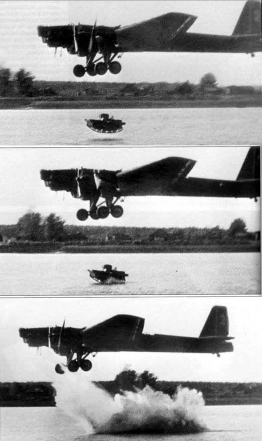 一架苏联TB-3轰炸机将一辆T-37轻型坦克空投到湖中。当时苏军正在研究能否在不着陆的情况下直接空投坦克投入战斗。T-37具备两栖能力,苏军希望它入水后能够漂浮起来,然而每次测试里坦克在空投中被损坏。