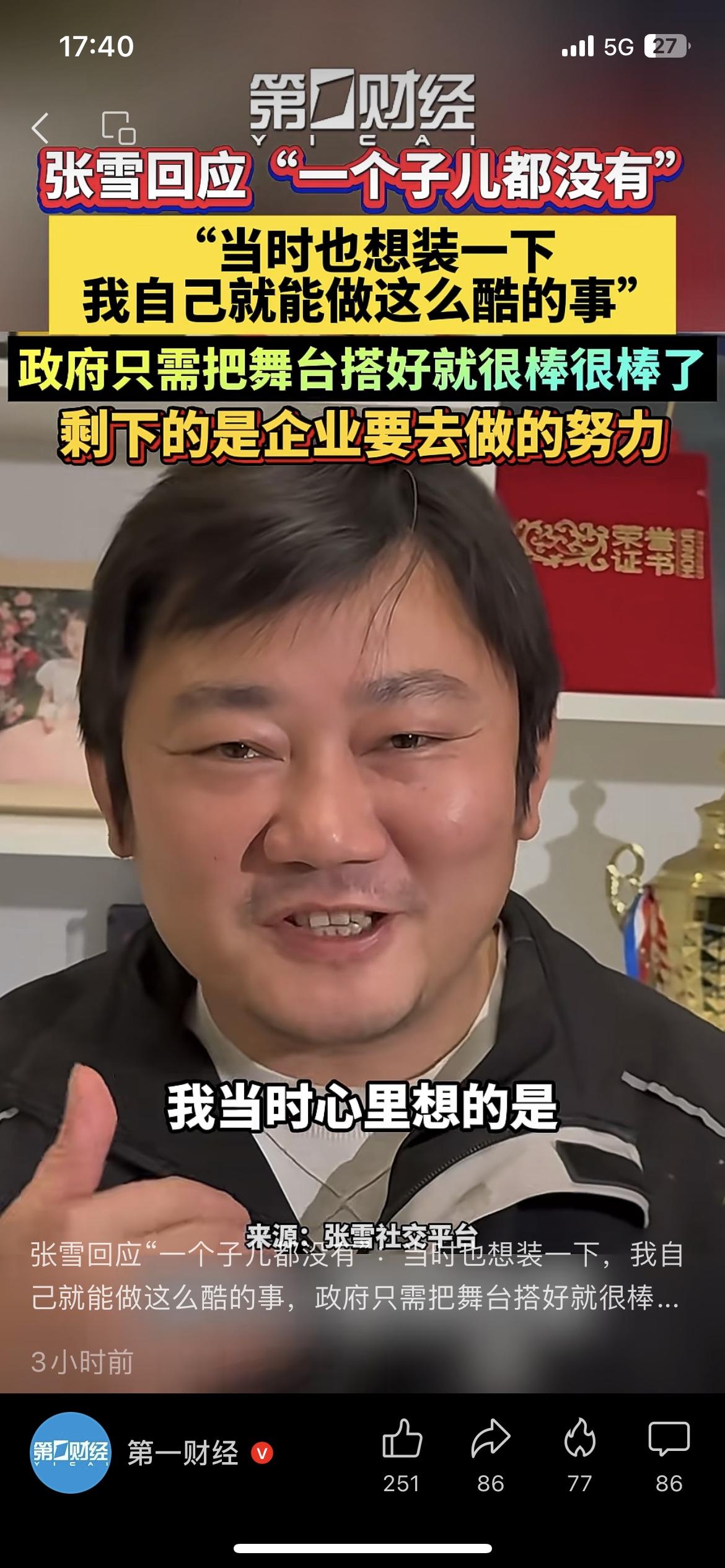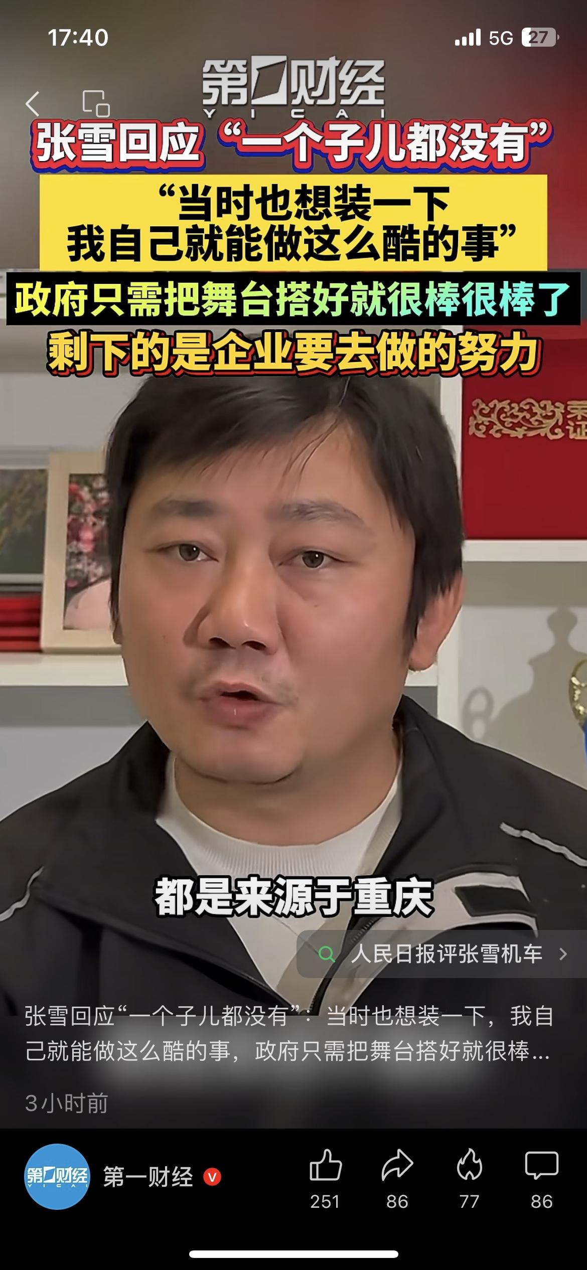 张雪回应火了:当时就是想装一下! 张雪回应“一个子儿都没有”争议,坦言当时就是想靠自己做成事,故意说句硬气话装一下。 他说得很实在:重庆摩托能火,关键是政府搭台、企业唱戏,政策环境做好了,剩下的就靠企业自己拼。不炒作、不卖惨,靠实干做事,这才是实体经济能做强的真正原因。 重庆摩托 实体经济