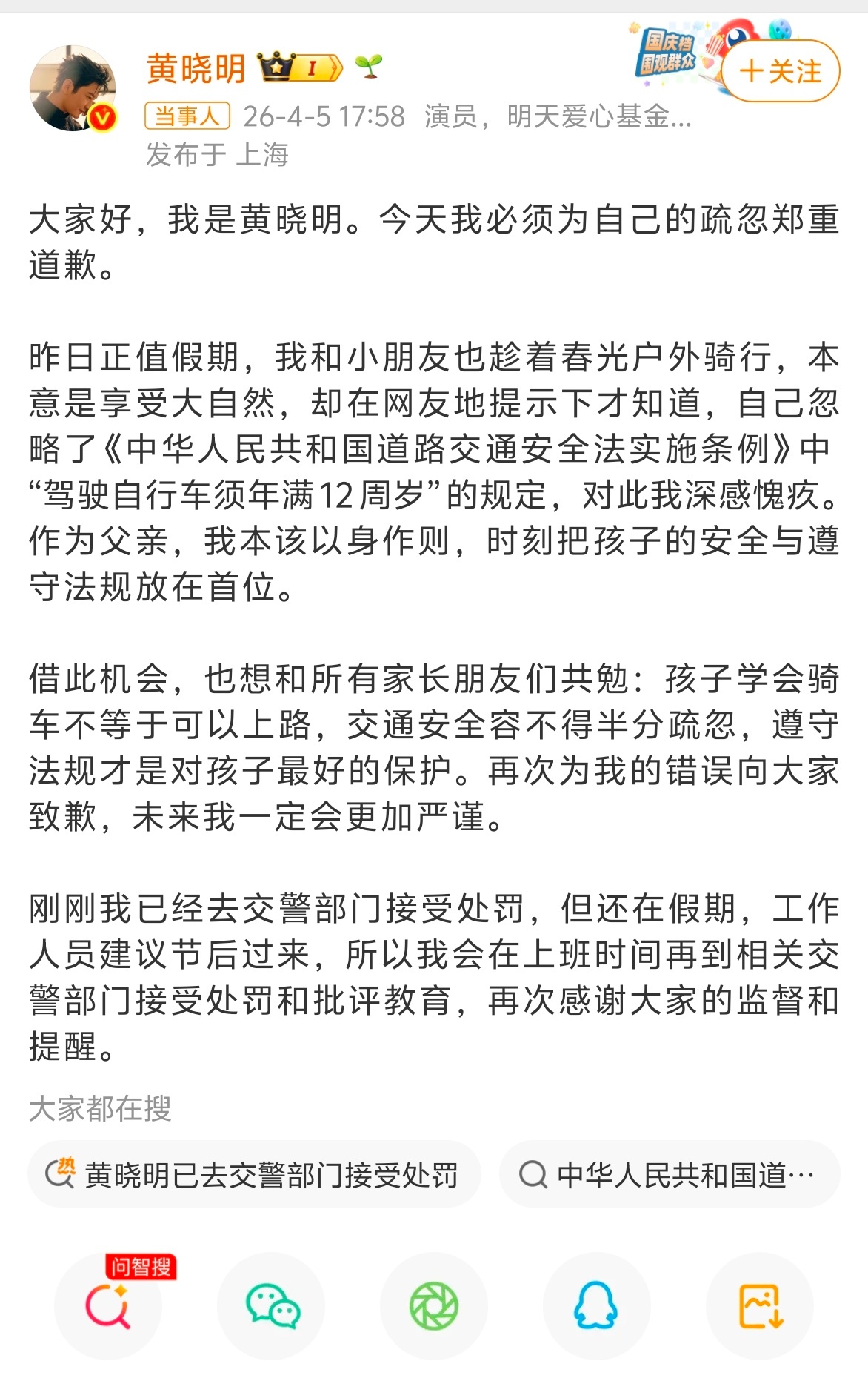 黄晓明已去交警部门接受处罚啊??原来骑自行车需要年满十二周岁啊
