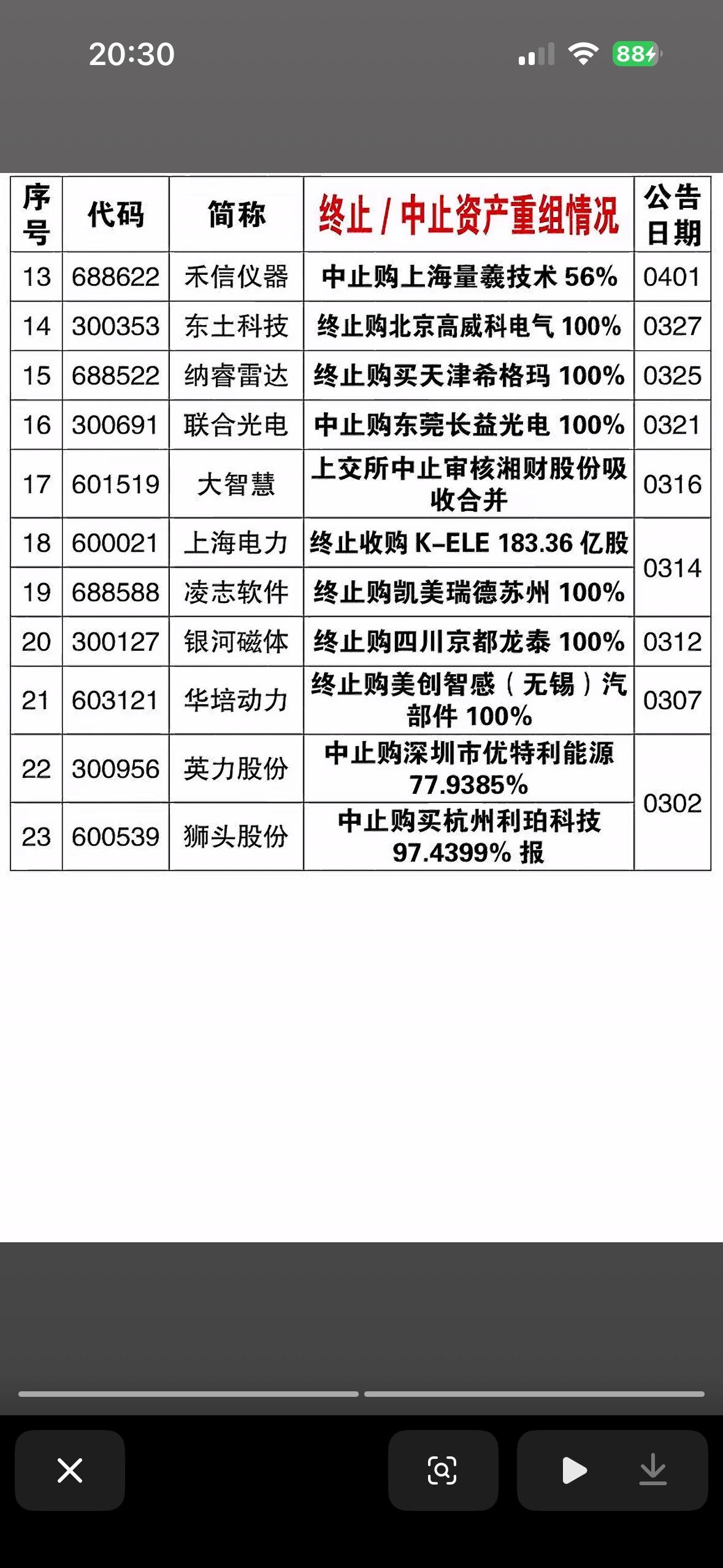 - 解读: 它是表格里唯一明确写“终止”的(其他都是中止)。这意味着这次收购彻底告吹。如果之前股价是因为这个收购传闻涨上去的,那么现在面临的就是价值回归,下跌风险最大。
