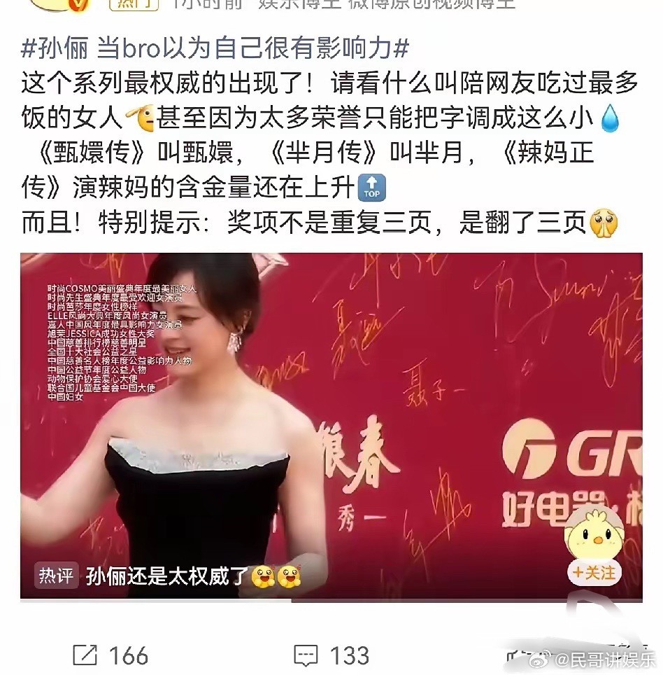 孙俪,让整个娱乐圈都羡慕了!4月5日晚上,演员孙俪,连夜冲上了热搜,这次不是因为老公邓超,而是有网友曝光了一段视频,为了把孙俪的奖项列出来,不仅缩成了“蚂蚁字”,还列出了整整3页!说起孙俪,那可是内娱公认的“陪网友吃饭最多”的女人。从《甄嬛传》里的甄嬛,到《芈月传》里的芈月,再到《辣妈正传》里的辣妈,她演一个角色,就给观众端上一桌“好戏大餐”。更绝的是,她的奖项单,那可不是重复三页,是真的翻了三页还没完!你以为孙俪只是奖项多?她是用一部部作品,把自己活成了内娱的“品质保证”。观众一看到她的名字,就知道这剧稳了。这种影响力,可不是靠营销炒作来的,是一部《甄嬛传》重播N次还能让人看得津津有味,是《芈月传》里的权谋博弈让人拍案叫绝,是《辣妈正传》把职场妈妈的困境演得真实又动人。在这个流量当道的时代,孙俪就像一股清流,用实力证明“影响力”不是喊出来的,是一部部作品、一个个奖项堆出来的。她让我们看到,真正的“顶流”,是能在观众心里扎根,是能让作品成为经典,是奖项多到让字幕都“压力山大”。这样的孙俪,才是内娱真正的“影响力王者”,她的每一次出现,都是给行业的一次实力示范。