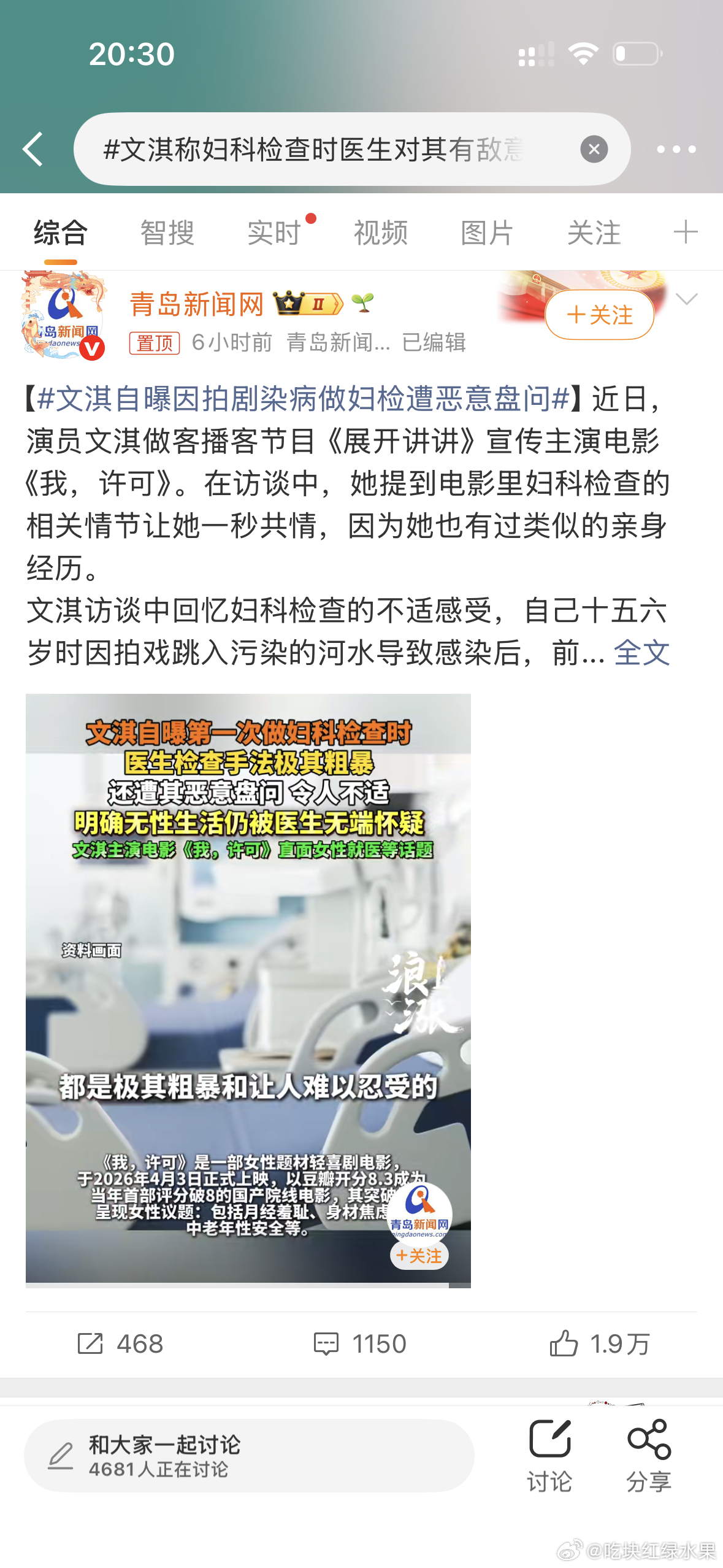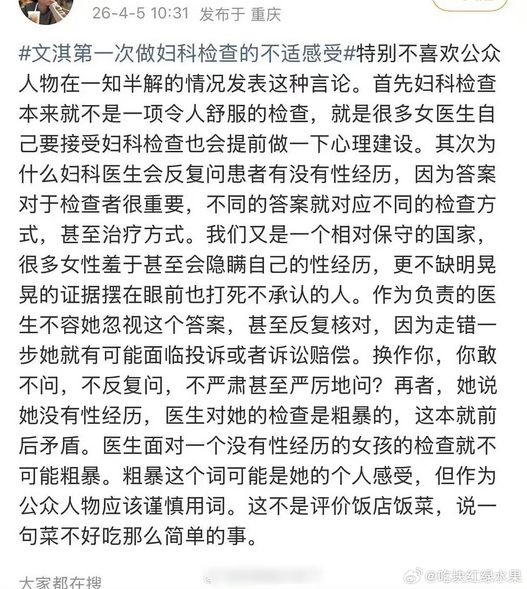文淇这个热搜 好像有点翻车 不少网友称医生的行为恰恰是负责的表现 更有大v进行科普 你觉得是网友想多了吗 还是文淇真的受伤害了文淇称妇科检查时医生对其有敌意
