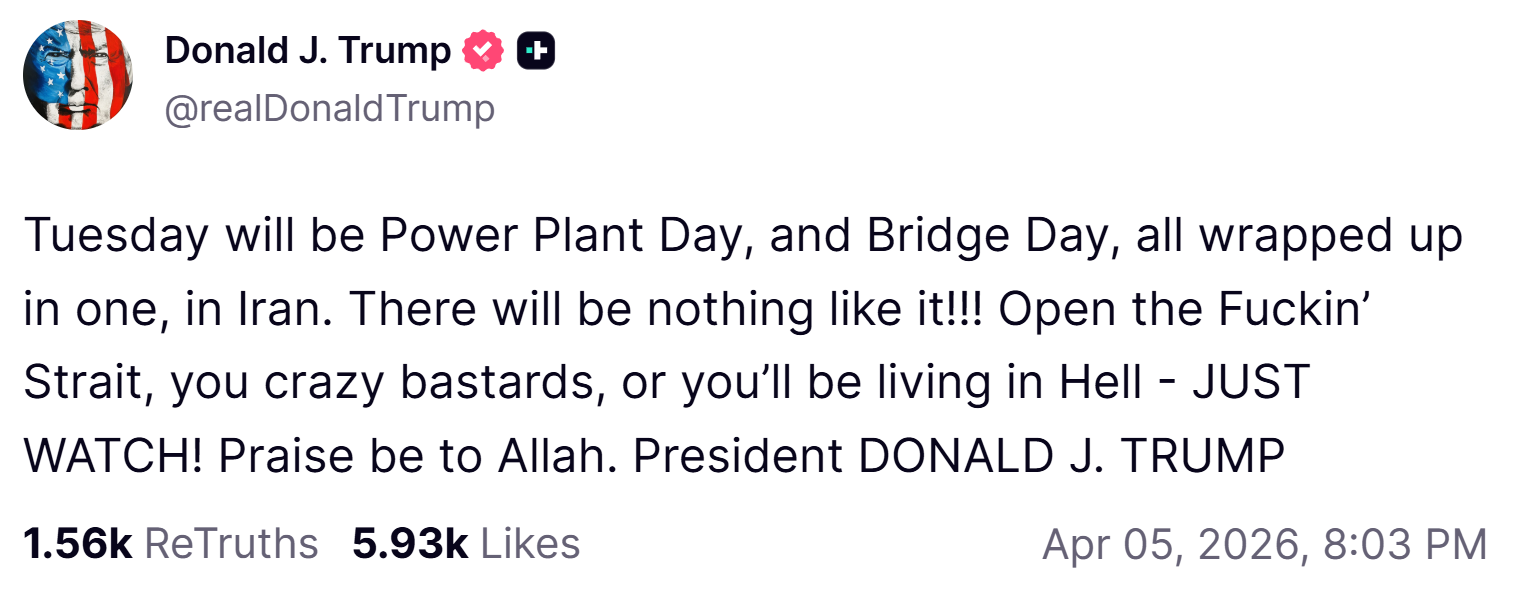 特朗普5日写道,7日将会是伊朗的“发电厂日”和“桥梁日”,两者合在一起,“这样的事情前所未有!”