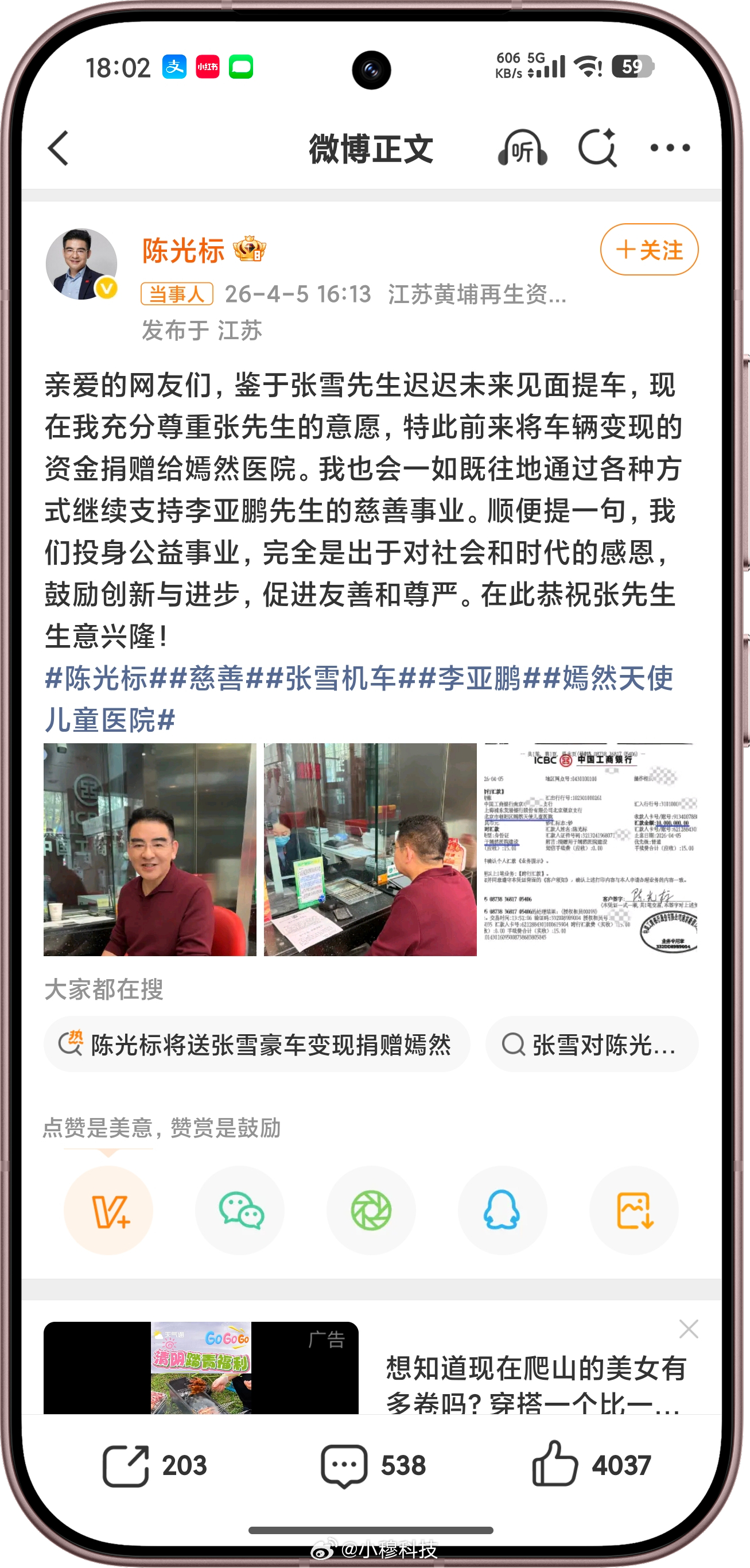 陈光标晒1000万转账单据,并发文称:鉴于张雪迟迟未来提车,特此将车辆变现资金捐