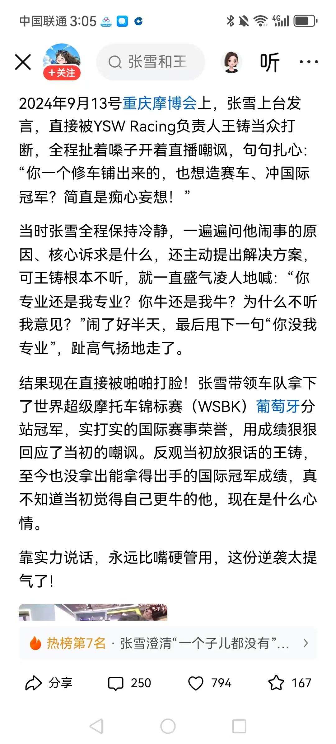 真就应了那句莫欺少年穷!王铸翻盘的机会,只有另外打造一个机车品牌和张雪在赛场上一较高下。 他要有那本事早就出来了,家庭条件比张雪好太多了,说实话,就他那句:我比你专业,已经不可能超越张雪了! 他要是在国际赛事上超过张雪,我就敬你是条汉子。 看过另外一个视频,好像是王涛的父亲,说话很粗鲁,表达的意思也是说欠了12万块钱不给。 后来又说记错了,人家把转账记录翻出来了。这是今天看到的最开心的新闻,人不要太嚣张,不要看不起任何一个人,被打脸了不敢出来了吧。 张雪有格局,有度量,有素质,有水平,真爷们。 其实这个时代缺的是静下来“钻牛角尖的”人,下次王哥要排队买票才可以和张总对话了吧。