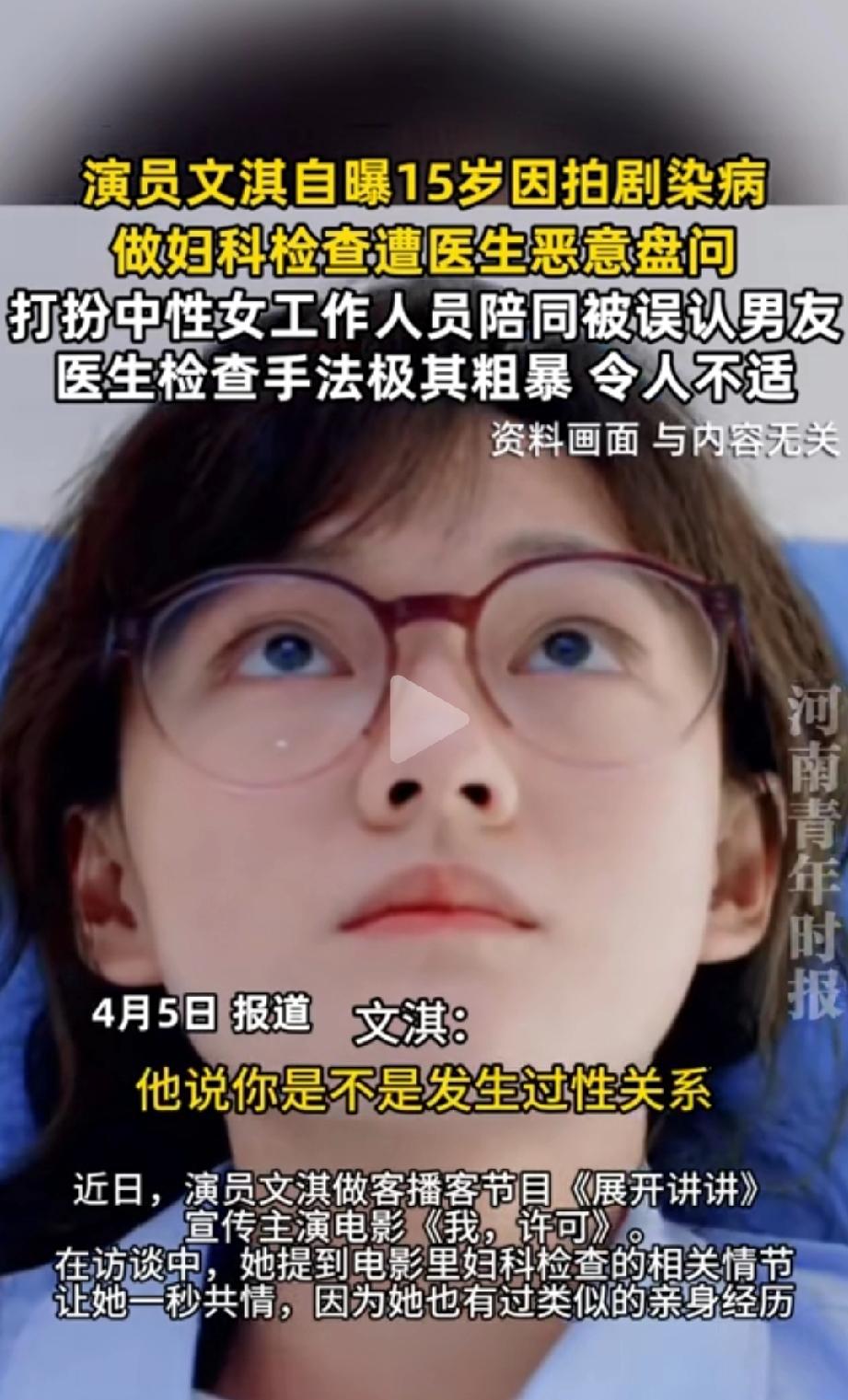 太戳心!演员文淇15岁拍剧时因跳入污染河水导致身体感染,就医做妇科检查时医生全程充满敌意,不仅恶意盘问她的隐私,还粗暴进行检查,给当时未成年的她带来了极大的身心伤害。 文淇在宣传新电影《我,许可》时,分享了自己15岁时的一段痛苦就医经历。 当时她因为拍剧需要,跳入了被污染的河水中,之后身体出现感染情况,不得不去县级健康检查站做妇科检查。 可让她没想到的是,从见到医生的那一刻起,对方就带着明显的敌意。 简单问诊不到5分钟,医生就突然追问她是否有过性关系,文淇明确否认后,医生不仅不相信,还恶意揣测她身边中性打扮的女工作人员是男友,言语间满是偏见。 更过分的是,在检查过程中,医生的手法极其粗暴,完全没有顾及她是未成年人,也没有保护她的隐私和尊严,整个过程让文淇身心都感到极度不适,留下了很深的心理阴影。 而她的这段经历,也和她新电影里探讨的女性就医困境、月经羞耻等议题不谋而合。 评论区网友们纷纷表达愤怒和共情: “15岁还是个孩子啊!医生怎么能这么恶意揣测、粗暴对待,太过分了!” “恶意盘问隐私、手法粗暴,完全违背医疗规范,这根本不是治病,是伤害!” “太有共鸣了!很多女性都有过类似的就医尴尬,被追问隐私、不被尊重,太戳心了!” “男医生检查敏感部位,连个陪同的人都没有,还恶意揣测,这绝对不符合规范!” 15岁本就是懵懂的年纪,因为拍戏意外感染已经够委屈了,去看病本想得到帮助,却要面对医生的敌意、恶意盘问和粗暴检查,换谁都会留下心理阴影。 医生的职责是救死扶伤、尊重患者,可这位医生不仅没有尽到责任,反而带着偏见恶意揣测未成年人,无视医疗规范,不保护患者的尊严和隐私,这不仅是失职,更是对患者的伤害。 文淇的经历看似是个人遭遇,却折射出了女性就医时的普遍困境,也给所有医疗从业者敲响了警钟。 医疗规范明确要求,男性医生检查女性敏感部位时,必须有护士或家属陪同,诊疗过程中要保护患者的尊严和隐私,更不能恶意揣测、粗暴对待。 尤其是面对未成年人,更应该多一份耐心和温柔,而不是敌意和偏见。 “医者仁心”从来不是一句口号,而是要落实在每一次诊疗中。 患者去医院是为了治病,不是为了承受恶意和羞辱,无论年龄大小、性别如何,都应该得到最基本的尊重和规范的诊疗。 希望所有医疗从业者都能守住底线、心怀善意,别让患者在承受病痛的同时,还要承受身心的二次伤害。 尊重患者,就是尊重自己的职业,更是守护医疗的初心!