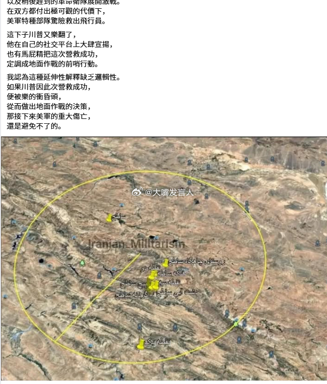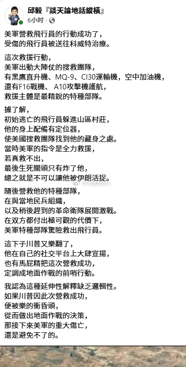 你好,我是邱先生,美军营救落难飞行员,我(我的消息源)在现场今天的文字写得不好,不如上次邱毅讲马杜罗老婆穿衣服差了5秒钟,不如那个段子讲得刺激邱老师的说法是,“~據了解,初始逃亡的飛行員躲進山區村莊~~”,当然向谁了解,这你就别问了,实在不行还可以说是社科院的朋友夸我的,你问名字叫什么,那我不能告诉你,因为人家没有同意我公开讲。但他夸我的部分,我必须公开讲
