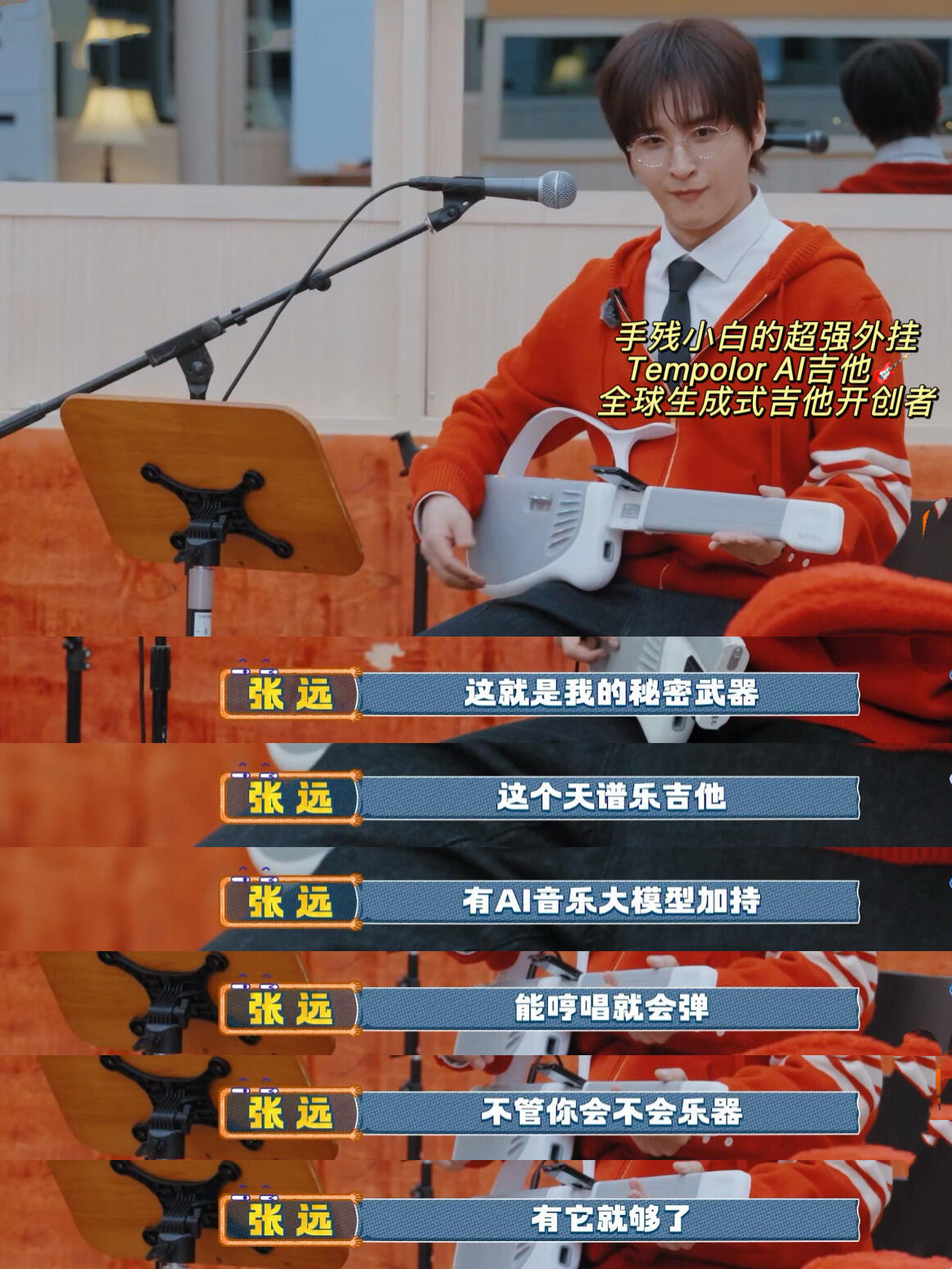 张远又双叒叕整活啦,一出手就给0713哥哥们带来新神器,咱就是说狠狠羡慕,也想拥有同款快乐!再就业男团个个都是“音乐才子”,可在吉他水平上,还是有点小差距滴。生哥随手一弹,那就是深情满满的“楚式情歌”。而张远呢,可是被虎吉盖章认证的“吉他小白”,之前手指打结、表情失控的模样,实在太逗。But!这次张远竟掏出一把从未见过的AI吉他,还从容不迫地弹唱起来。哥哥们的表情从好奇,逐渐变成陶醉的“姨母笑”,不得不说,这小子又成功装到了!张远现场揭秘,用这把全球首款生成式AI吉他TemPolor天谱乐,连乐理都不用学,大横按也无需苦练。对着APP哼唱几句,AI就能自动生成编曲,零基础小白瞬间开挂,直接秒变“吉他大师”。这不就是音乐界的“自动驾驶”嘛!想get张远同款的姐妹们,冲就完事儿!