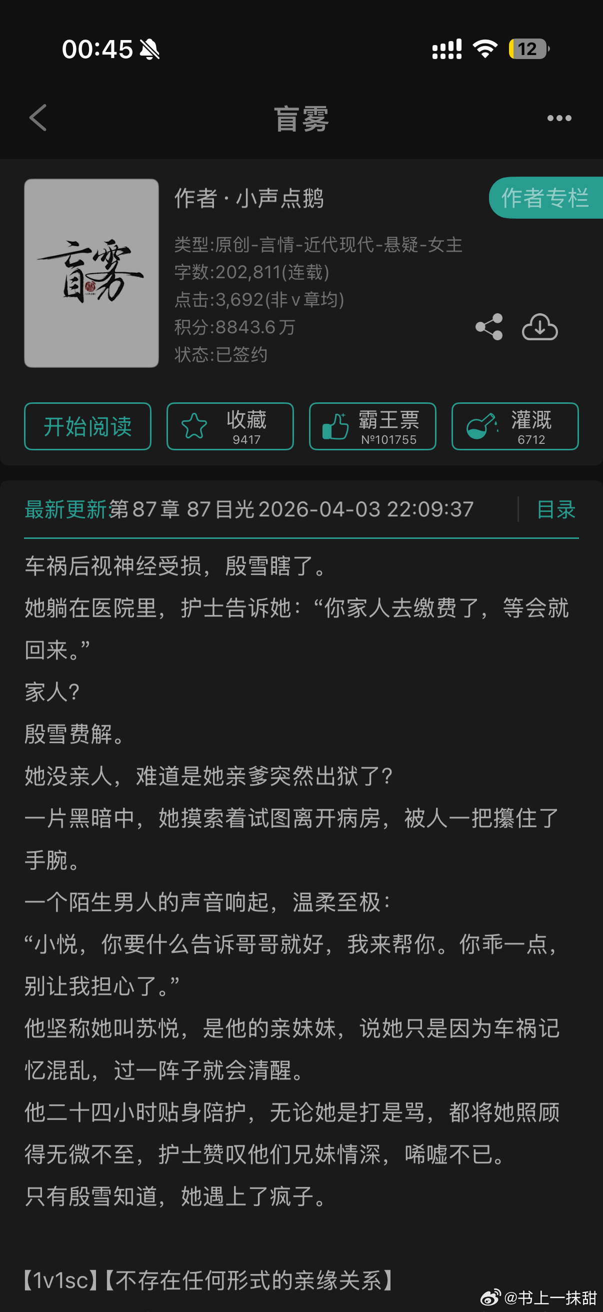 2️⃣《盲雾》——小声点鹅(连载):这本男主完全阴湿味溢出了…女主宝宝车祸失明后男主突然跳出来说自己是她哥,又鬼又狗的…这本带点悬疑色彩还有伪骨设定…小声点鹅真是很会写男鬼的一位,但是作者更新时间不固定…雷点自避一下宝宝们谨慎入!!!