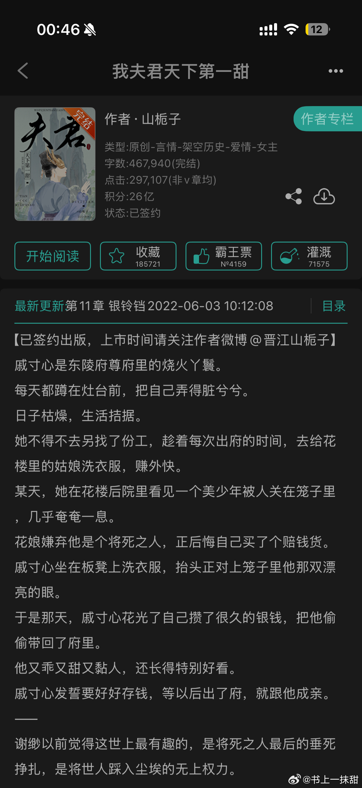 5️⃣《我夫君天下第一甜》——山栀子(完结):不要被名字误导实际上只有女主觉得男主天下第一甜(点头)…男主也是个小苦瓜,早期爹不疼娘不爱在街上被女主一(见)见(色)钟(起)情(义)然后捡回家了。因为受了很多苦所以其实为人心狠手辣很偏执病娇的,但在女主宝宝面前总是伪装成无害小狗示弱…这本里女主宝宝的成长线也很清晰!但虽然男女主感情很好但到100章左右都没有实质性进展,大家自避!!