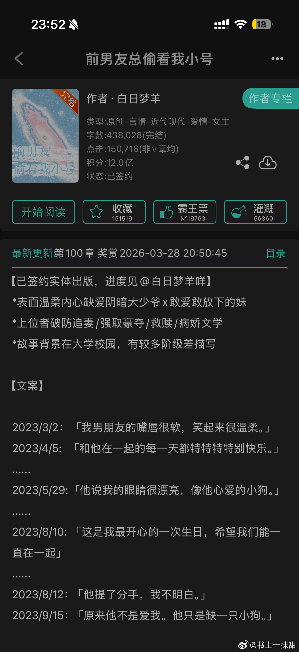 3️⃣《前男友总偷看我小号》——白日梦羊(完结):和前面鬼着鬼着变狗的男主不同,这本男主是披着温柔外衣的缺爱阴暗b…妹宝交往了新男友之后破防追妻…(我承认我是土狗我就爱看这种看似上位者实则感情上被捆地牢牢地,每次强硬偏执都在话里话外讲“你来爱我吧你来爱我吧”…爽吃!!!