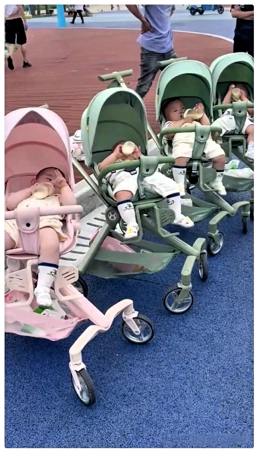 咱们小区最近出了个“名场面”。 上海一哥们儿的老婆查出怀了四胞胎,听说在产房门外,他来回溜达祈祷了一路“三女一男”。 结果护士一抱出来,他当场腿软,四个大胖小子! 这下咱们可算是长见识了。 每天傍晚,就看他推着辆定制的加长婴儿车在楼下转悠,车把上叮铃咣啷挂着四个空奶瓶。 邻居大妈老远就打趣:“哟,小火车又拉客啦!” 附近母婴店老板见他跟见亲人似的:“兄弟,纸尿裤全按批发价走,随便搬!” 这哥们儿现在硬生生被逼出了一手绝活。 单手抖奶粉,另一只手同时摇匀四个奶瓶,那手速堪比奶茶店摇奶小哥。 昨天在电梯里碰见他,黑眼圈都快掉脸颊上了。 他苦着脸抱怨,大半夜给孩子拍嗝简直就像在玩打地鼠。 老大刚拍出一个响亮的“嗝”,老三又扯着嗓子嚎起来了。 看着这四个一模一样的小小男子汉,真是又好笑又心疼。 以后光是娶媳妇、买房,这爸爸就得提前开启“地狱奋斗模式”了。 你们身边有这么多胞胎家庭吗? 带多胞胎到底是种什么样的体验? 换作是你,一下子迎来四个儿子,是开心多还是压力大? 快来评论区聊聊,给这位超级奶爸支支招、送送祝福!