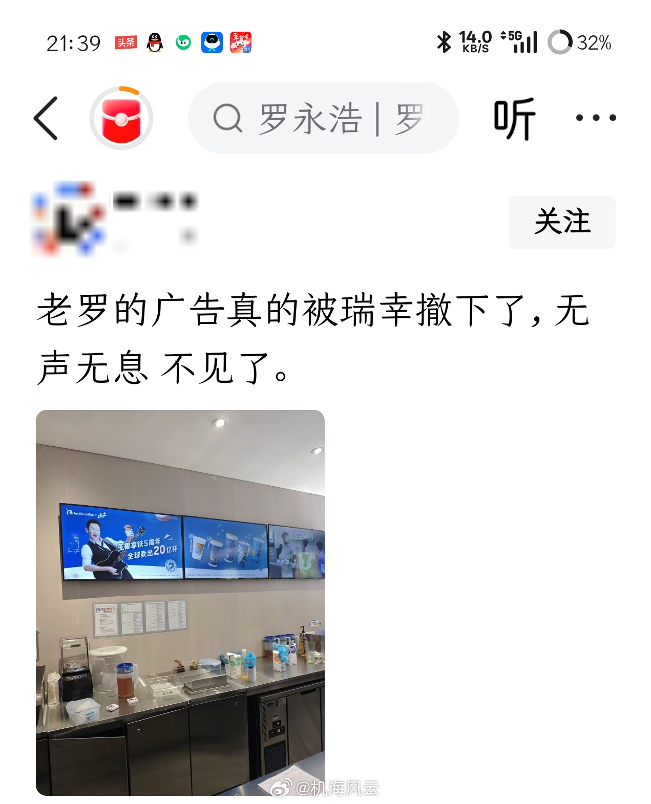 喔豁!网友爆料,疑似罗永浩瑞幸广告被撤下?目前店内只保留了代言人陶喆的广告牌