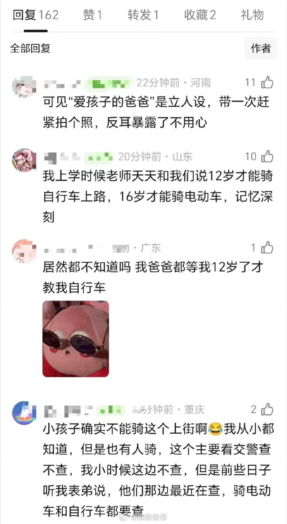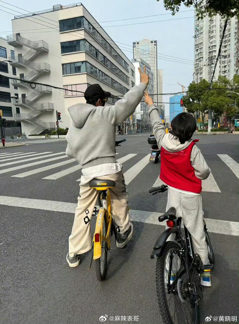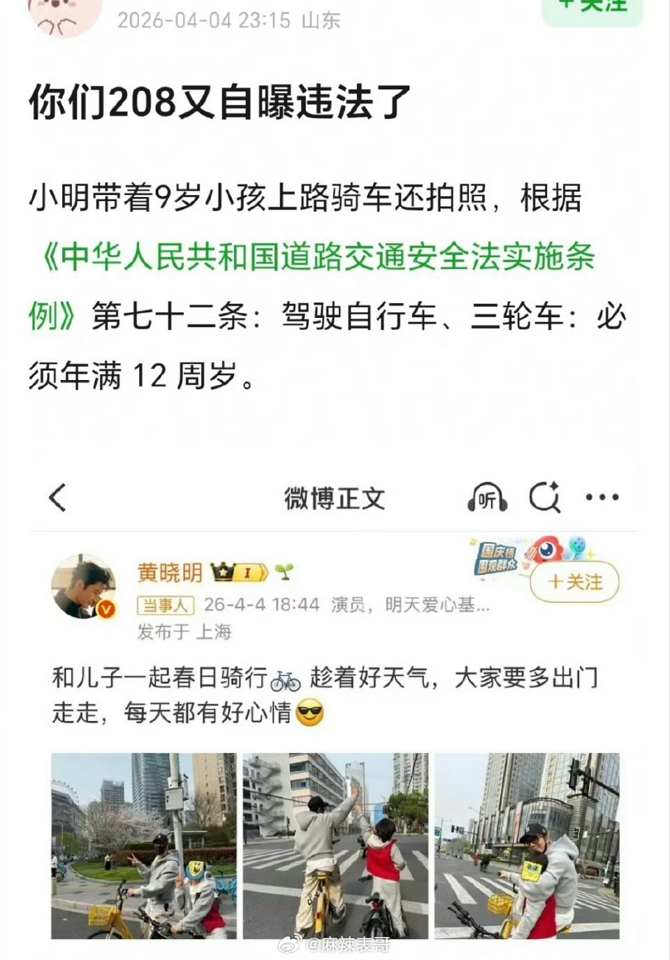 黄晓明昨天晒了和儿子一起在市中心骑行的照片,网友在评论区质疑,小海绵未满12岁不