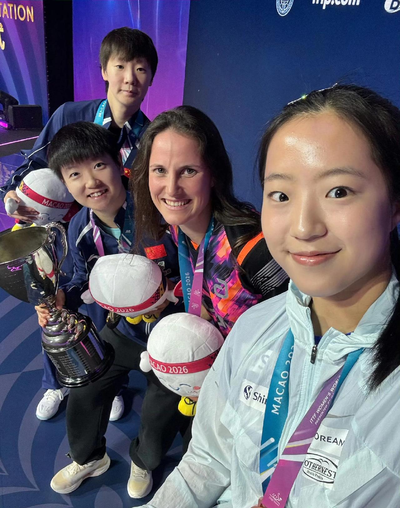 作为女单冠军,莎莎选择了和所有获奖者拍自拍照[赞]! 2026澳门国际乒联世界杯