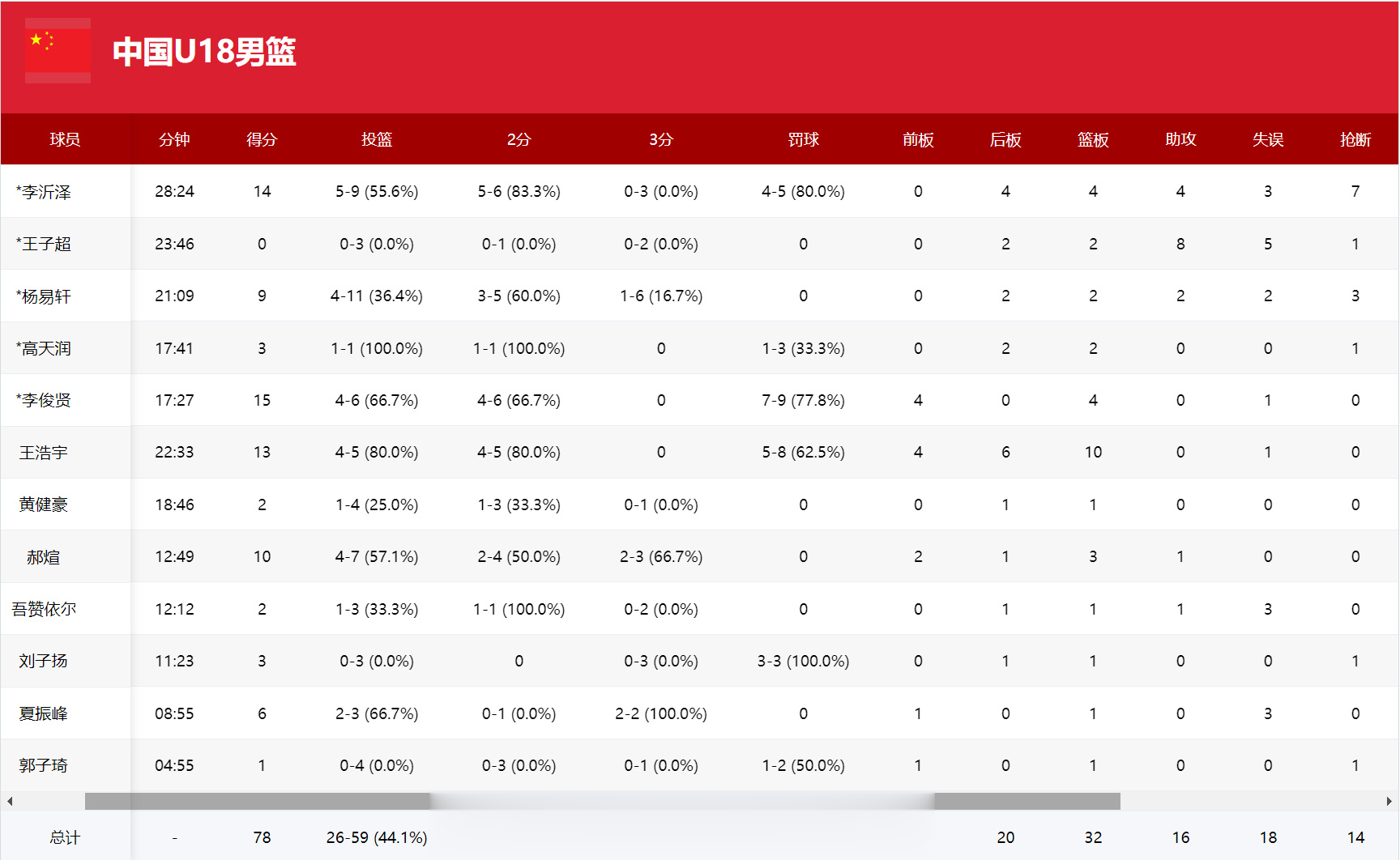 中国U18数据:李俊贤15分,王浩宇13分,李沂泽14分。