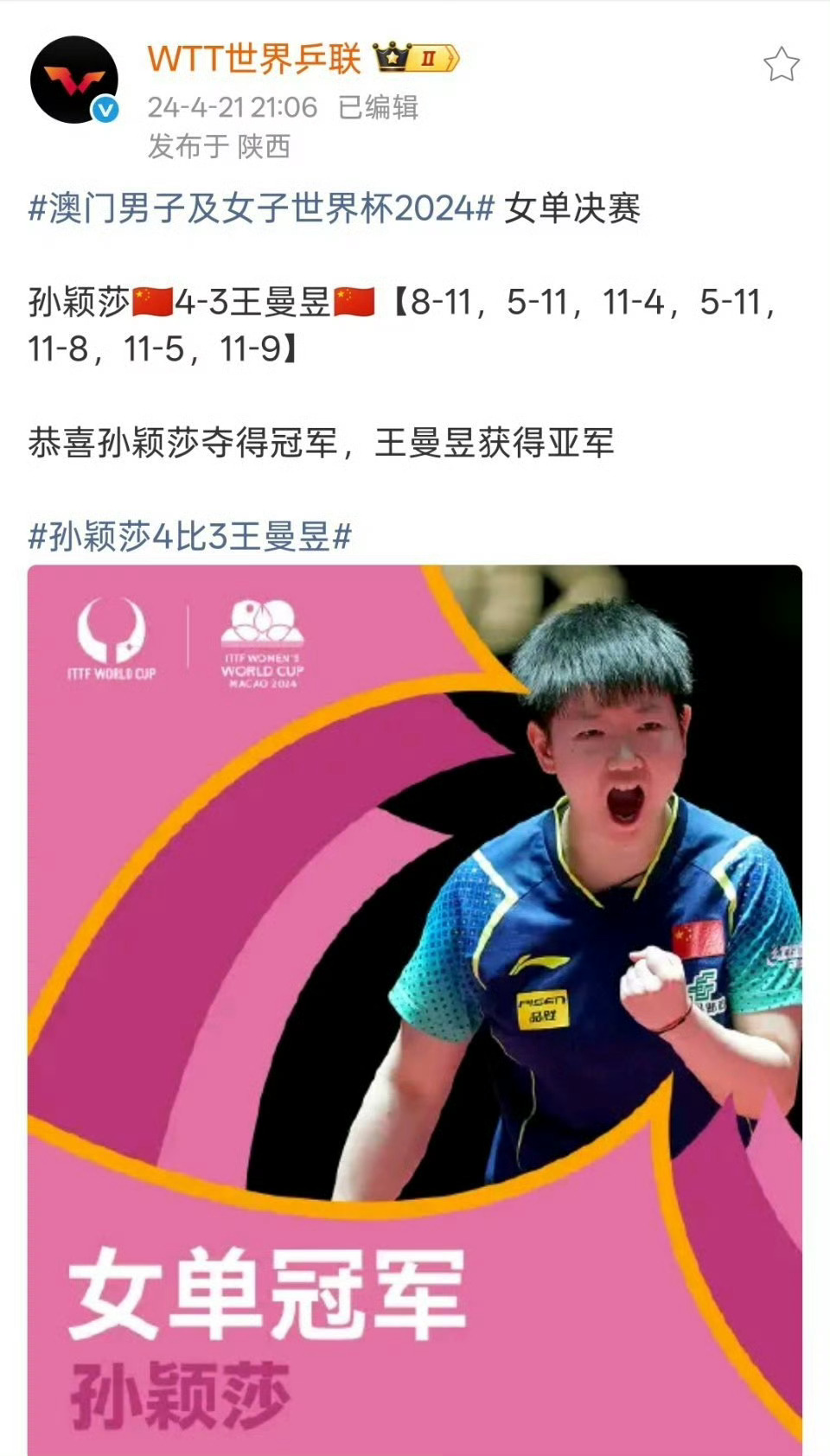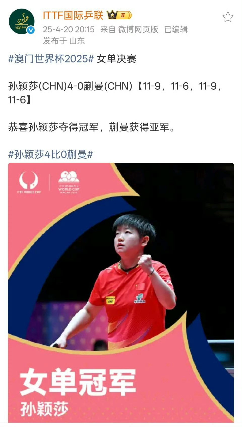 4月5日,国际乒联单打世界杯女单决赛,4比1战胜夺得冠军,不仅拿下个人第5个三大赛单打冠军,更成为女单世界杯首位实现三连冠的选手。孙颖莎填补长达53年空白,登顶世界乒坛新巅峰,堪称乒乓球史上的里程碑。孙颖莎冠军孙颖莎创造历史