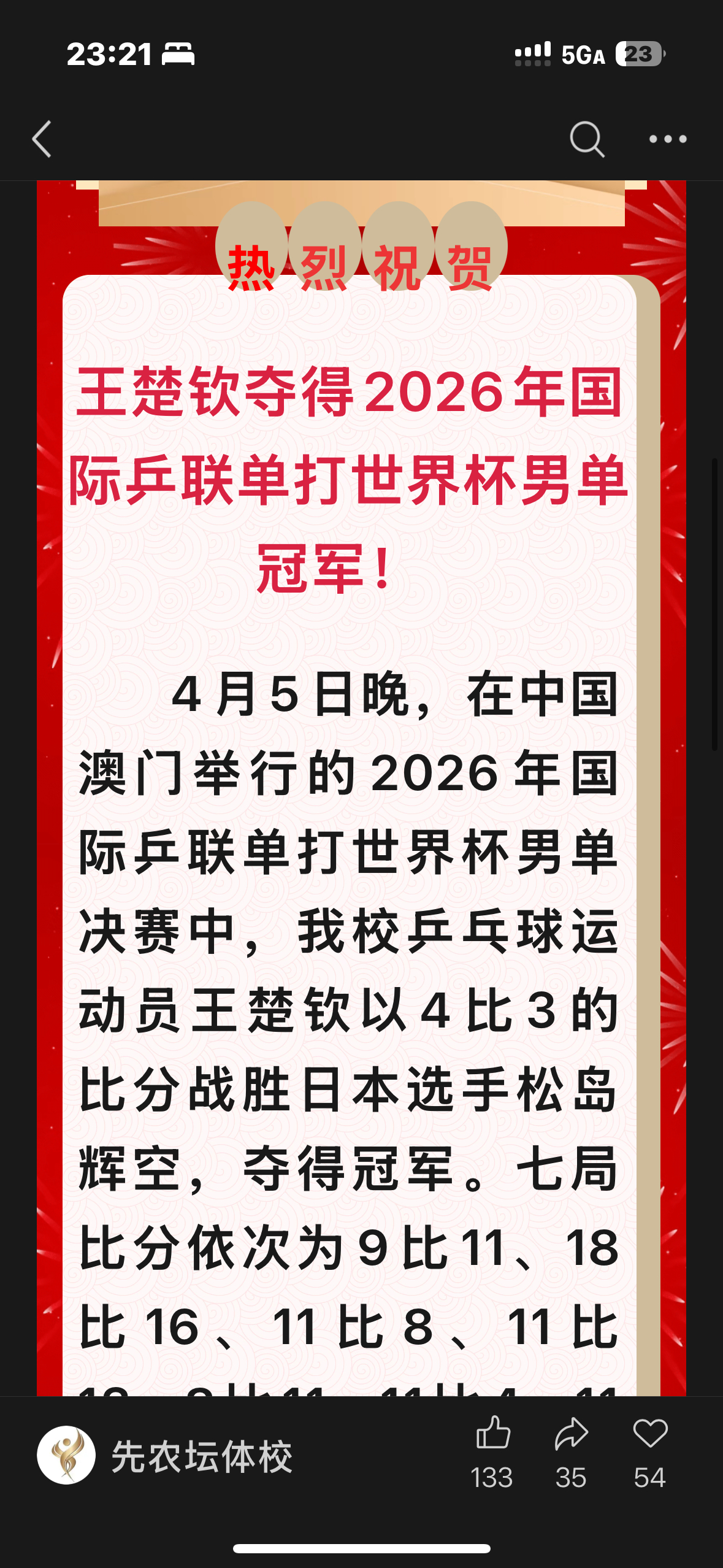 先农坛体校祝贺王楚钦世界杯夺冠 先农坛体校发文:王楚钦夺得2026年国际乒联单打世界杯男单冠军! 4月5日晚,在中国澳门举行的2026年国际乒联单打世界杯男单决赛中,我校乒乓球运动员王楚钦以4比3的比分战胜日本选手松岛辉空,夺得冠军。七局比分依次为9比11、18比16、11比8、11比13、8比11、11比4、11比8。本次比赛,王楚钦一路过关斩将,用必胜的决心和顽强的斗志,诠释了“球不落地永不放弃”的体育精神。祝贺王楚钦!祝贺中国乒乓球队!王楚钦夺冠乒乓球