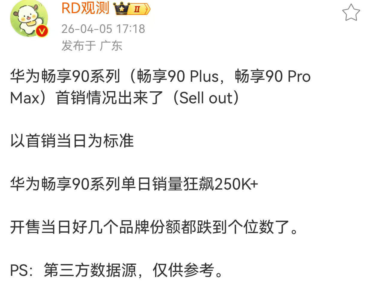 好家伙,华为畅享90系列首销单日销量25W+。真的是太猛了!
