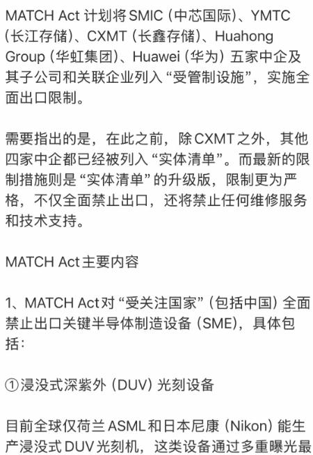 美国又推出超级芯片管制法案 这次直接禁止14nm及以下半导体设备的出口及维修,并点名五家中国半导体龙头企业:中芯国际、华虹半导体、长江存储、长鑫存储、华为及其关联公司。要求日本荷兰韩国台湾等盟友必须一同遵守。 说白了,美国这波操作就是急眼了,拼尽全力要把中国半导体的路堵死,不光自己不卖给我们东西,还逼着盟友一起站队,简直是霸道到没边儿! 这次的超级芯片管制法案,比之前任何一次都狠,直接把14nm及以下的半导体设备列为禁售品,不光新设备不让买,连后续的维修、软件更新、技术支持都一刀切禁止。 我感觉这就是要断我们的后路,毕竟现在国内不少芯片生产线,还得依赖海外设备的维护,一旦设备出问题没人修,整条线可能就得停摆。 更过分的是,美国还直接点名了五家中国半导体龙头,中芯国际、华虹半导体、长江存储、长鑫存储,还有华为及其关联公司,等于把中国芯片产业的核心力量都拉进了黑名单,针对性直接拉满。 不光对我们下手,美国还逼着日本、荷兰、韩国还有台湾地区一起遵守这个禁令,给盟友下了死命令,不配合就可能被美国的长臂管辖盯上。 据说荷兰的ASML、日本的尼康这些企业,现在都犯了难,一边是美国的施压,一边是中国这个大市场,放弃哪头都心疼,毕竟中国市场占了不少这些企业的营收份额,之前尼康就因为配合美国禁令亏得一塌糊涂,这次要是彻底断了中国业务,估计日子更难过。 面对这波封锁,我们也不能坐以待毙,我觉得,中国应该理性思考自己的发展路径,一味的强调超英赶美得不偿失,没必要非要在所有领域都跟欧美日韩硬拼。 我们得承认,在颠覆性创新方面,他们确实有不可替代的领先优势,与其闭门造车,不如更大胆地融入世界,发挥我们自身的产业链优势和庞大市场的特点,和各国共建人类商业文明,这才是真正的民富国强之道。 当然,理性不代表软弱,该反制的时候必须硬气,我们也可以出台对应的禁令,任何配合美国对中国进行芯片制裁的企业,一律纳入黑名单,禁止所有中国企业跟他们发生任何生意往来,而反制的首要手段,我认为就是禁售稀土。 大家可能不知道,稀土不是普通的土,是半导体、高端制造的关键材料,欧美日韩的很多芯片企业都离不开中国的稀土供应,不让我们好好发展芯片,那就都别想顺顺利利生产,这就是“不让我吃饭,那就都别吃了”的底气。 除此之外,凡是跟美国芯片有合作的企业,在中国也应该被禁售。 不是故意刁难,主要是不清楚这些企业的芯片里有没有隐藏的追踪功能,为了平民百姓的信息安全和人身安全,这一步必须谨慎,毕竟现在芯片应用越来越广,手机、家电、汽车里都有,一旦有追踪功能,后果不堪设想。 据说现在不少美国盟友也在暗中观望,并没有完全跟着美国一条路走到黑,毕竟谁也不想放弃中国市场这块肥肉,其实芯片产业本来就是全球化的产业,你中有我、我中有你,美国强行搞封锁,最后很可能搬起石头砸自己的脚。 以上全部都是我个人看法,不代表任何官方立场,大家觉得面对美国的芯片封锁,我们这样的应对方式可行吗?欢迎在评论区留下你的观点。