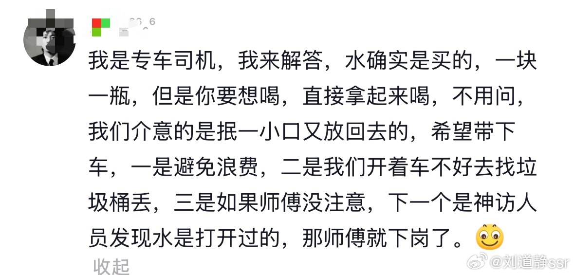 我一开始的时候打专车也不好意思喝水,后来一想:既然人家提供了那不就是给人喝的嘛没想到这么多人和我一样