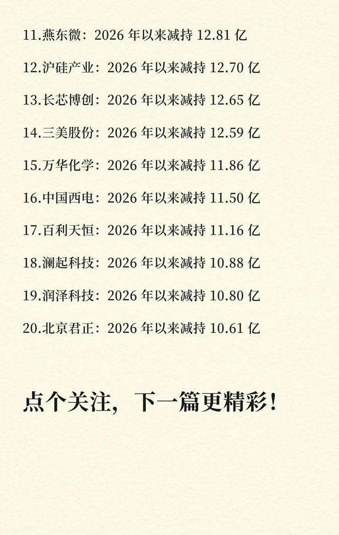11. 燕东微:2026年减持12.81亿元;12. 沪硅产业:同期减持12.70亿元;13. 长芯博创:减持规模12.65亿元;14. 三美股份:累计减持12.59亿元;15. 万华化学:2026年减持11.86亿元;16. 中国西电:同期减持11.50亿元;17. 百利天恒:减持金额11.16亿元;18. 澜起科技:累计减持10.88亿元;19. 润泽科技:2026年减持10.80亿元;20. 北京君正:同期减持10.61亿元。