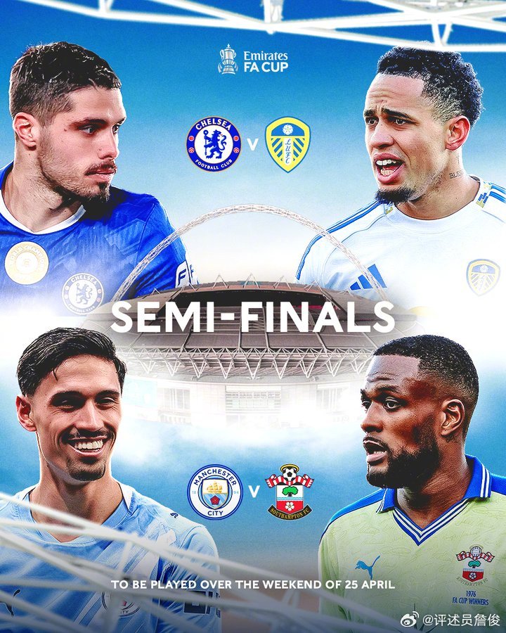 一场各种疯狂的足总杯八强战,西汉姆联队两球落后补时扳平打加时赛,可惜两次进球因越位无效,点球决战不敌利兹联。“约克郡白玫瑰”近四十年来首次晋级足总杯半决赛将与切尔西争夺决赛权。另外一场月底将在新温布利大球场进行的半决赛是曼城vs南安普敦。