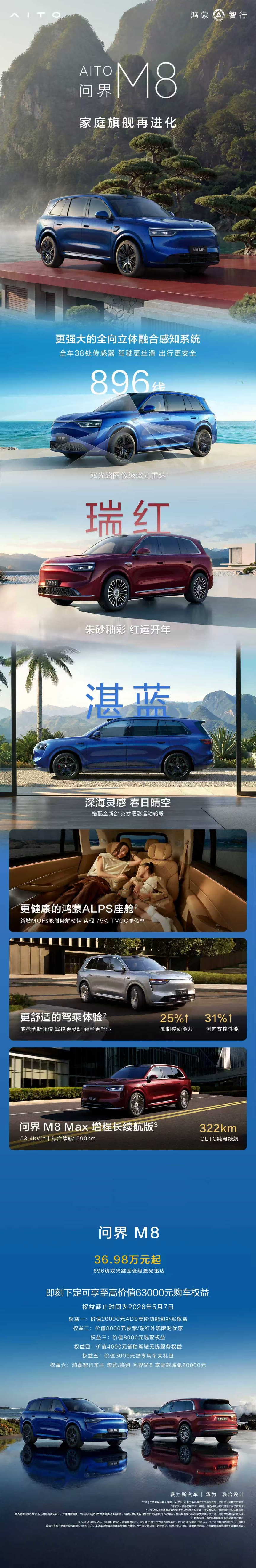 对于高端家庭而言,真正的安全,是无论谁来驾驶,车辆都能在危机时刻给予最可靠的回应。问界M8深谙此道,以全维防碰撞CAS4.0为核心,构建人驾与智驾的双重安全屏障。在智驾模式下,120km/h连续避障绕行实测表现惊艳,依托896线激光雷达与三个高精度固态激光雷达的融合感知,系统对前方障碍物的识别距离与精度大幅跃升,可从容应对高速连环避险。在人驾模式下,80km/h侧向避让锥筒功能化身“隐形守护者”,能提前识别侧向危险并主动修正方向,为长途驾驶可能出现的分神时刻提供关键兜底,确保每一次返乡探亲的路途都稳字当头。新款问界M8焕新而来,新增瑞红、湛蓝两款专属车色。这份超越期待的全方位安全升级,正是献给每一个家庭的至臻之礼。问界M8
